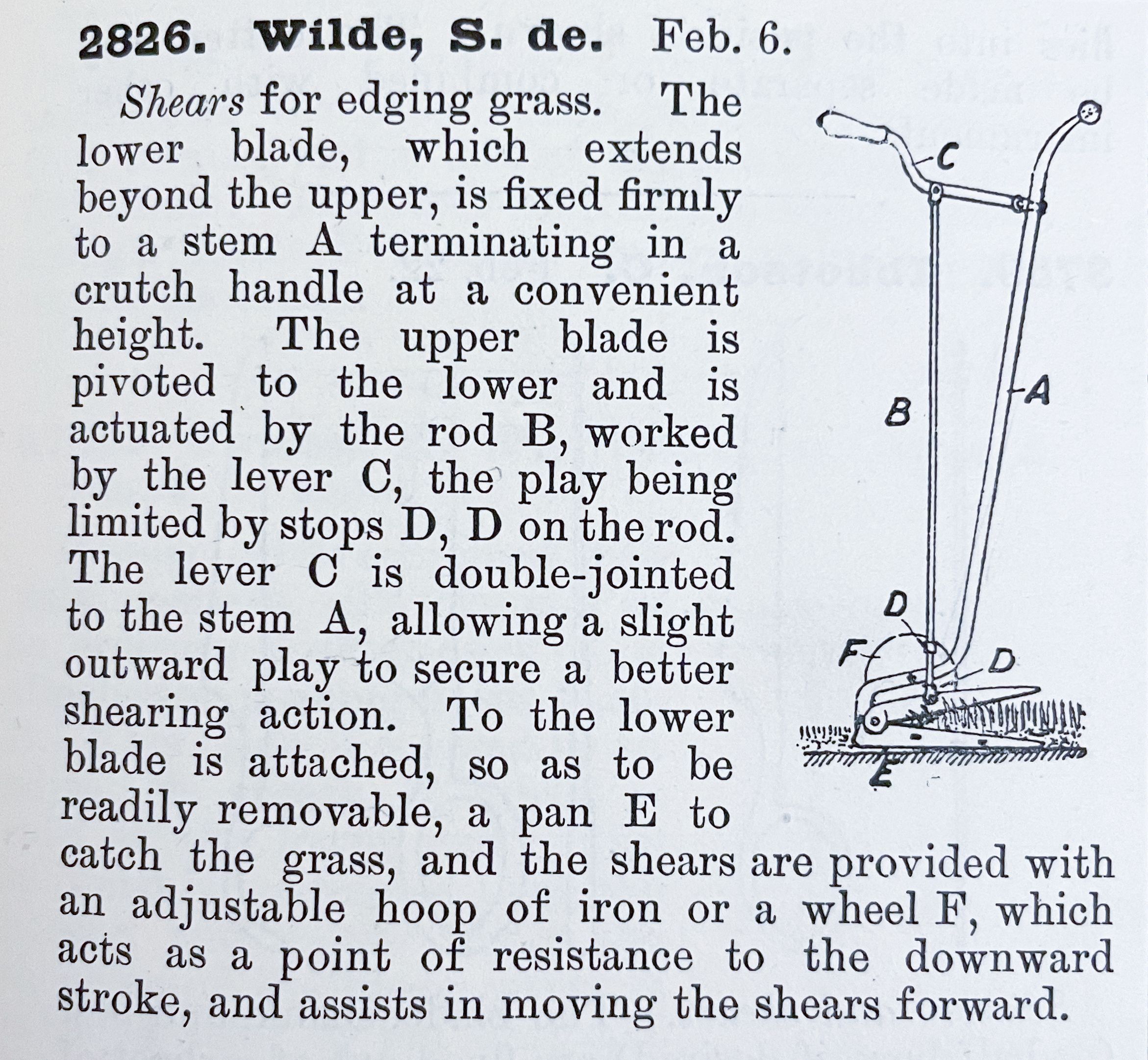Shears for edging grass. The lower blade, which extends beyond the upper, is fixed firmly to a stem A terminating in a crutch handle at a convenient height. The upper blade is pivoted to the lower and is actuated by the rod B, worked by the lever C, the play being limited by stops D, D on the rod. The lever C is double-jointed to the stem A, allowing a slight outward play to secure a better shearing action. To the lower blade is attached, so as to be readily removable, a pan E to catch the grass, and the shears are provided with an adjustable hoop of iron or a wheel F, which acts as a point of resistance to the downward stroke, and assists in moving the shears forward.Cataloged By