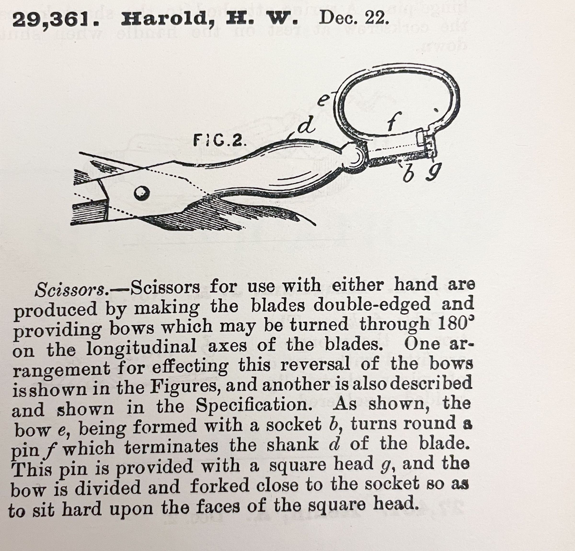 Scissors. -- Scissors for use with either hand are produced by making the blades double-edged and providing bows which may be turned through 180 on the longitudinal axes of the blades. One arrangement for effecting this reversal of the bows is shown in the Figures, and another is also described and shown in the Specification. As shown, the bow e, being formed with a socket b, turns round a pin f which terminates the shank d of the blade. This pin is provided with a square head g, and the bow is divided and forked close to the socket so as to sit hard upon the faces of the square head.Cataloged By