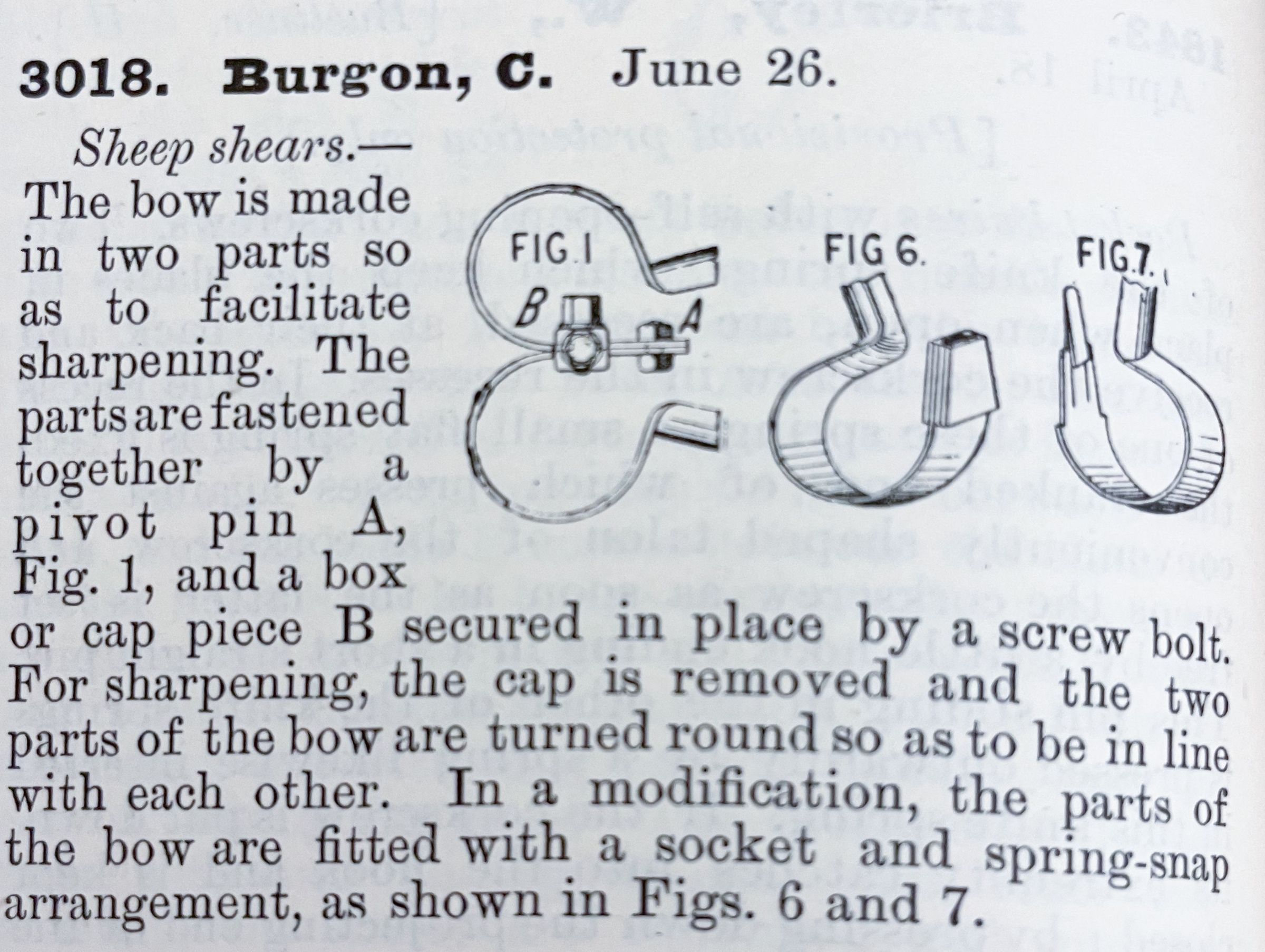 Sheep shears. -- The bow is made in two parts so as to facilitate sharpening. The parts are fastened together by a pivot pin A, Fig. 1, and a box or cap piece B secured in place bye a screw bolt. For sharpening, the cap is removed and the two parts of the bow are turned round so as to be in line with each other. In a modification, the parts of the bow are fitted with a socket and spring-snap arrangement, as show in Figs. 6 and 7.Cataloged By