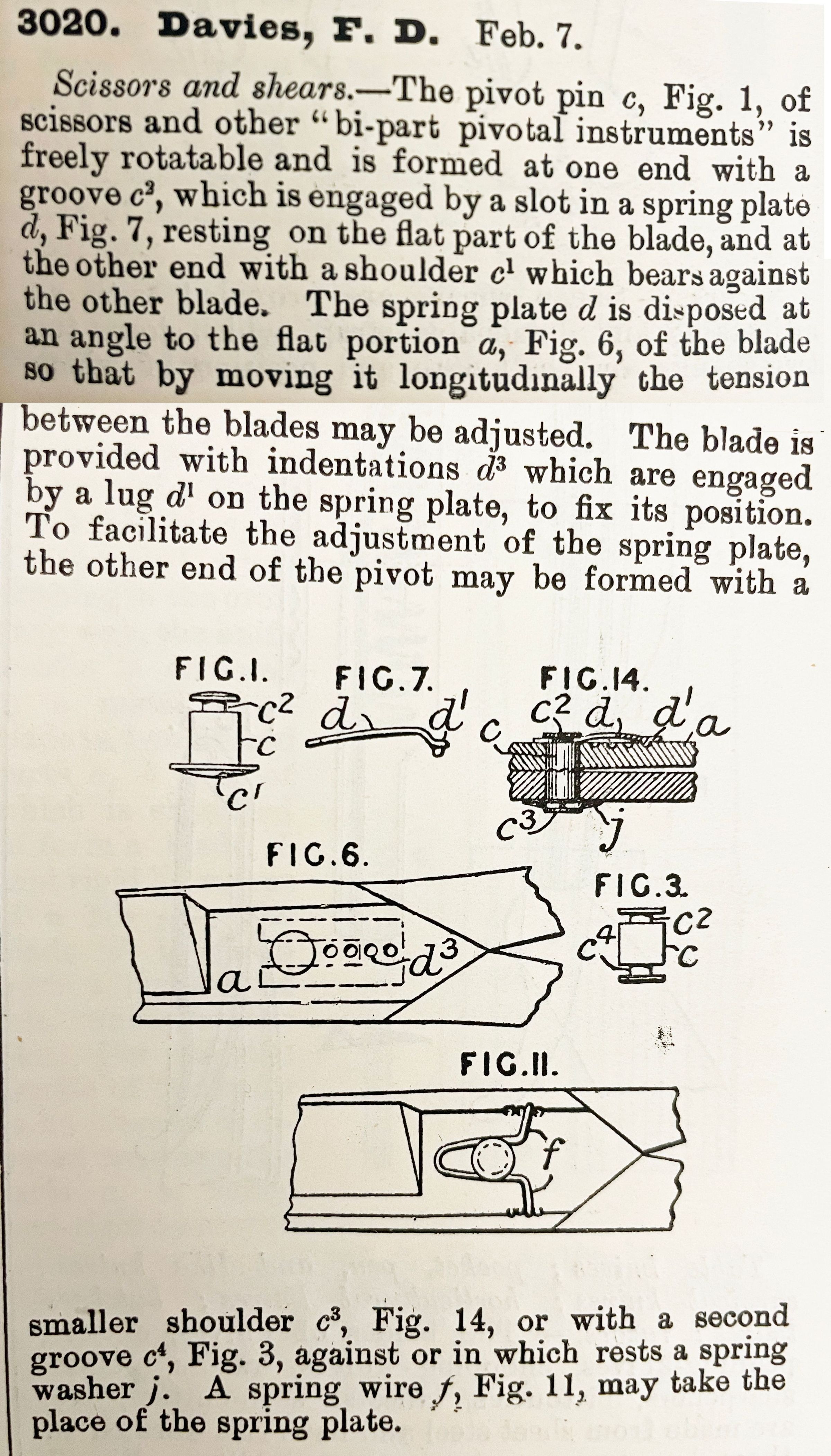 Scissors and shears. -- The pivot pin c, Fig. 1, of scissors and other "bi-part pivotal instruments" is freely rotatable and is formed at one end with a groove c2, which is engaged by a slot in a spring plate d, Fig. 7, resting on the flat part of the blade, and at the other end with a shoulder c1 which bears against the other blade. The spring plate d is disposed at an angle to the flat portion a, Fig. 6, of the blade so that by moving it longitudinally the tension between the blades may be adjusted. The blade is provided with indentations d3 which are engaged by a lug d1 on the spring plate, to fix its position. To facilitate the adjustment of the spring plate, the other end of the pivot may be formed with a smaller shoulder c3, Fig. 14, or with a second groove c4, Fig. 3, against or in which rests a spring washer j. A spring wire f, Fig. 11, may take the place of the spring plate.Cataloged By