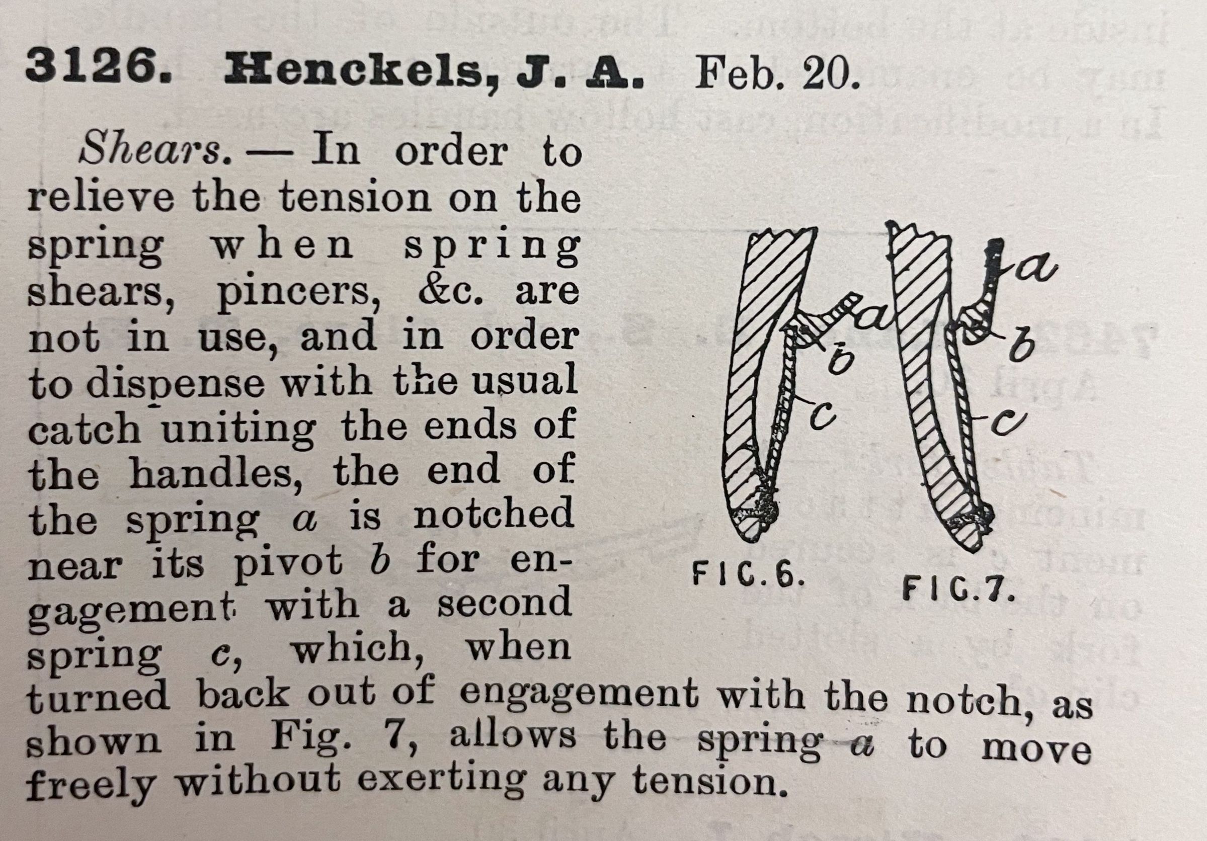 Shears. -- In order to relieve the tension on the spring when spring shears, pincers, &c. are not in use, and in order to dispense with the usual catch uniting the ends of the handles, the end of the spring a is notched near its pivot b for engagement with a second spring c, which, when turned back out of engagement with the notch, as shown in Fig. 7, allows the spring a to move freely without exerting any tension.Cataloged By