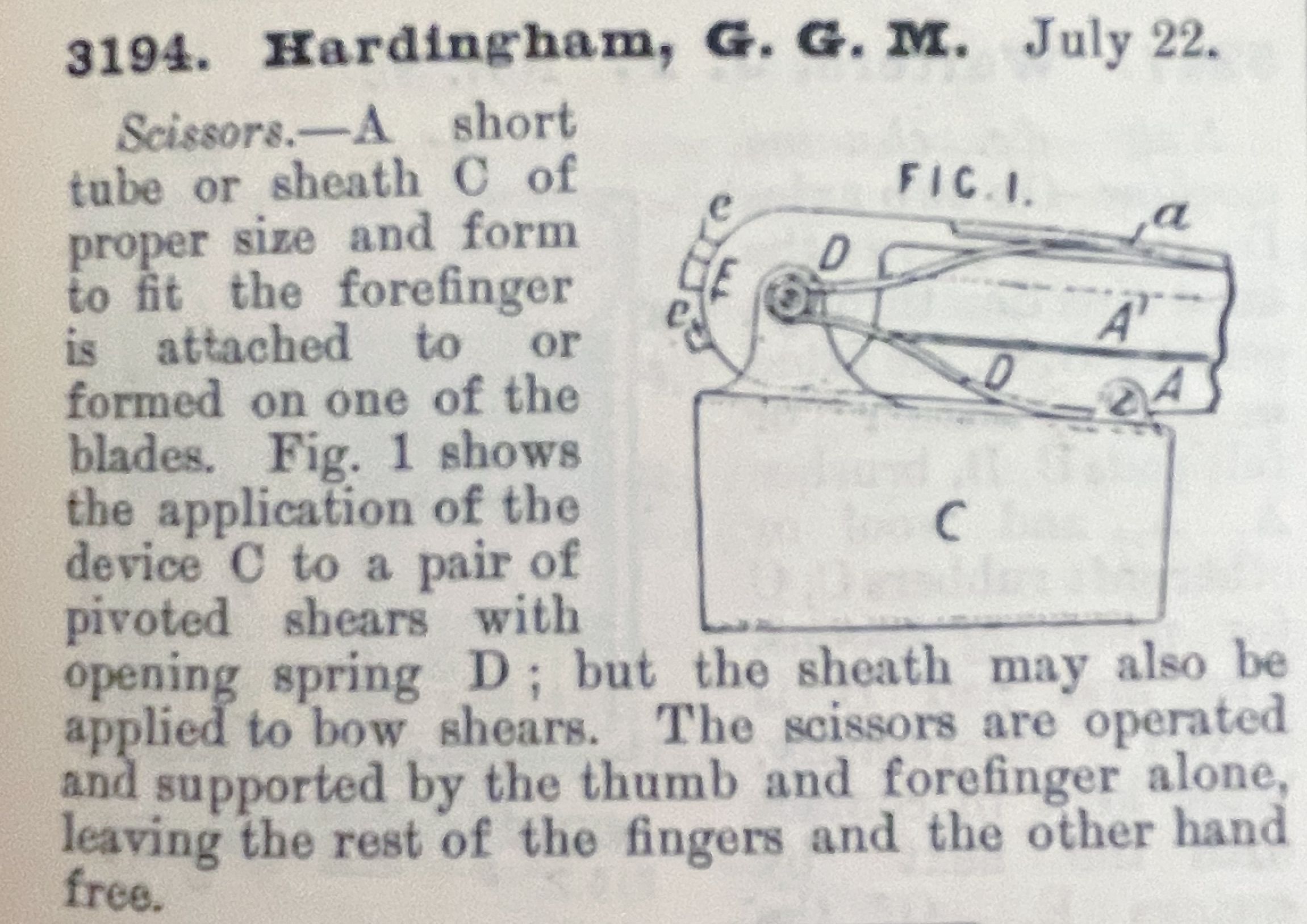 Scissors. -- A short tube or sheath C of proper size and form to fit the forefinger is attached to or formed on one of the blades. Fig. 1 shows the application of the device C to a pair of pivoted shears with opening spring D; but the sheath may also be applied to bow shears. The scissors are operated and supported by the thumb and forefinger alone, leaving the rest of the fingers and the other hand free.Cataloged By