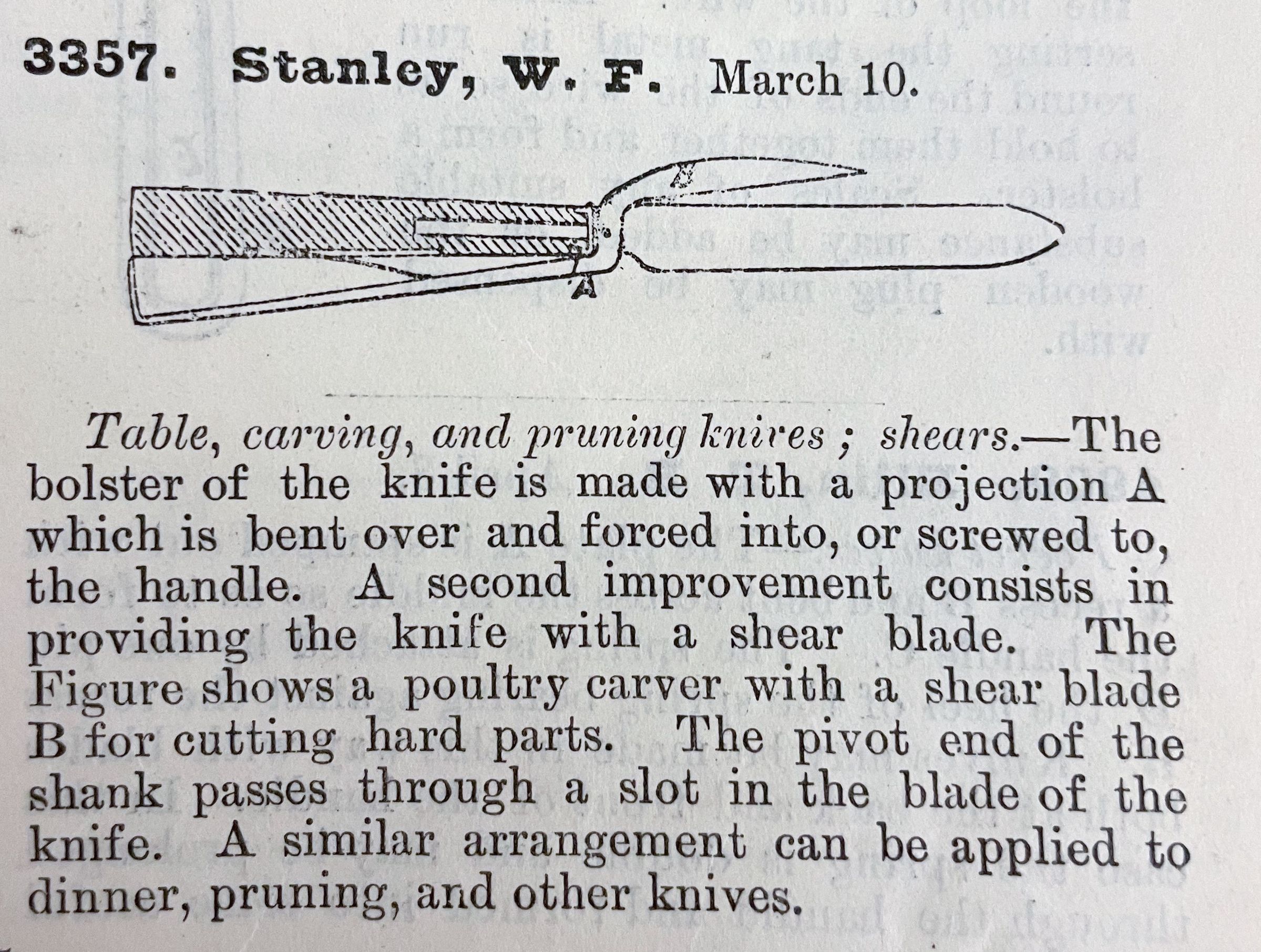 Table, carving, and pruning knives; shears. -- The bolster of the knife is made with a projection A which is bent over and forced into, or screwed to, the handle. A second improvement consists in providing the knife with a shear blade. The Figure shows a poultry carver with a shear blade B for cutting hard parts. The pivot end of the shank passes through a slot in the blade of the knife. A similar arrangement can be applied to dinner, pruning, and other knives.Cataloged By
