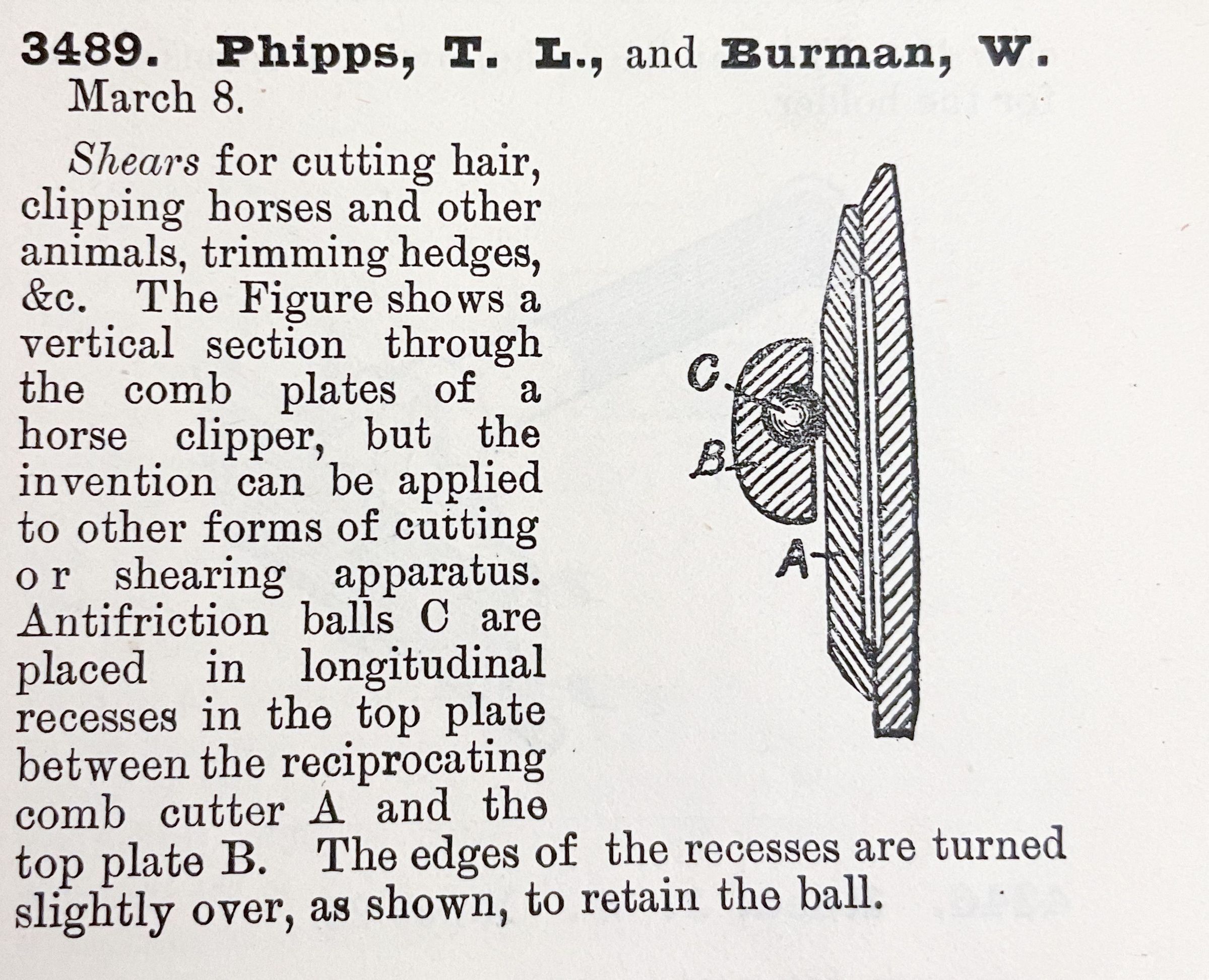 Shears for cutting hair, clipping horses and other animals, trimming hedges &c. The Figure shows a vertical section through the comb plates of a horse clipper, but the invention can be applied to other forms of cutting or shearing apparatus. Antifriction balls C are placed in longitudinal recesses in the top plate between the reciprocating comb cutter A and the top plate B. The edges of the recesses are turned slightly over, as shown, to retain the ball.Cataloged By