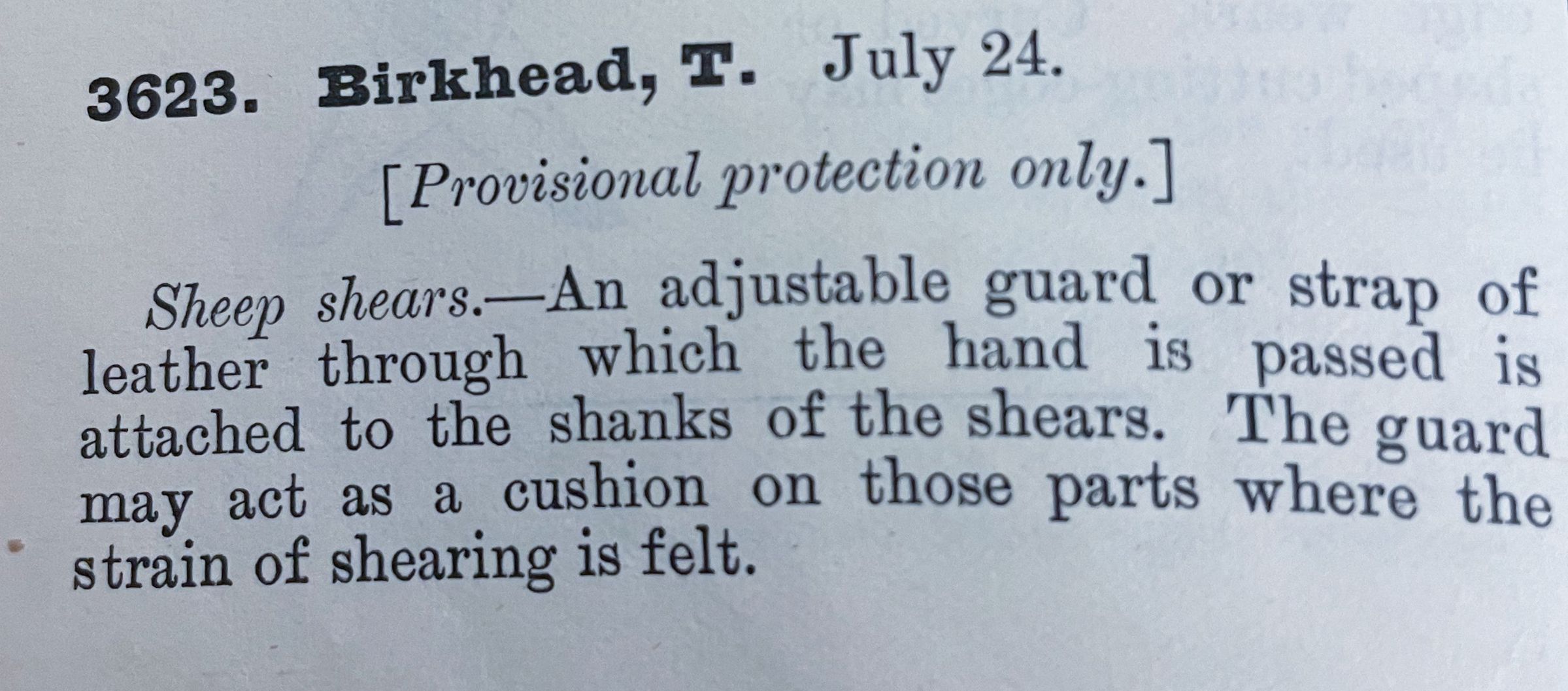 Sheep shears. -- An adjustable guard or strap of leather through which the hand is passed is attached to the shanks of the shears. The guard may act as a cushion on those parts where the strain of shearing is felt.Cataloged By