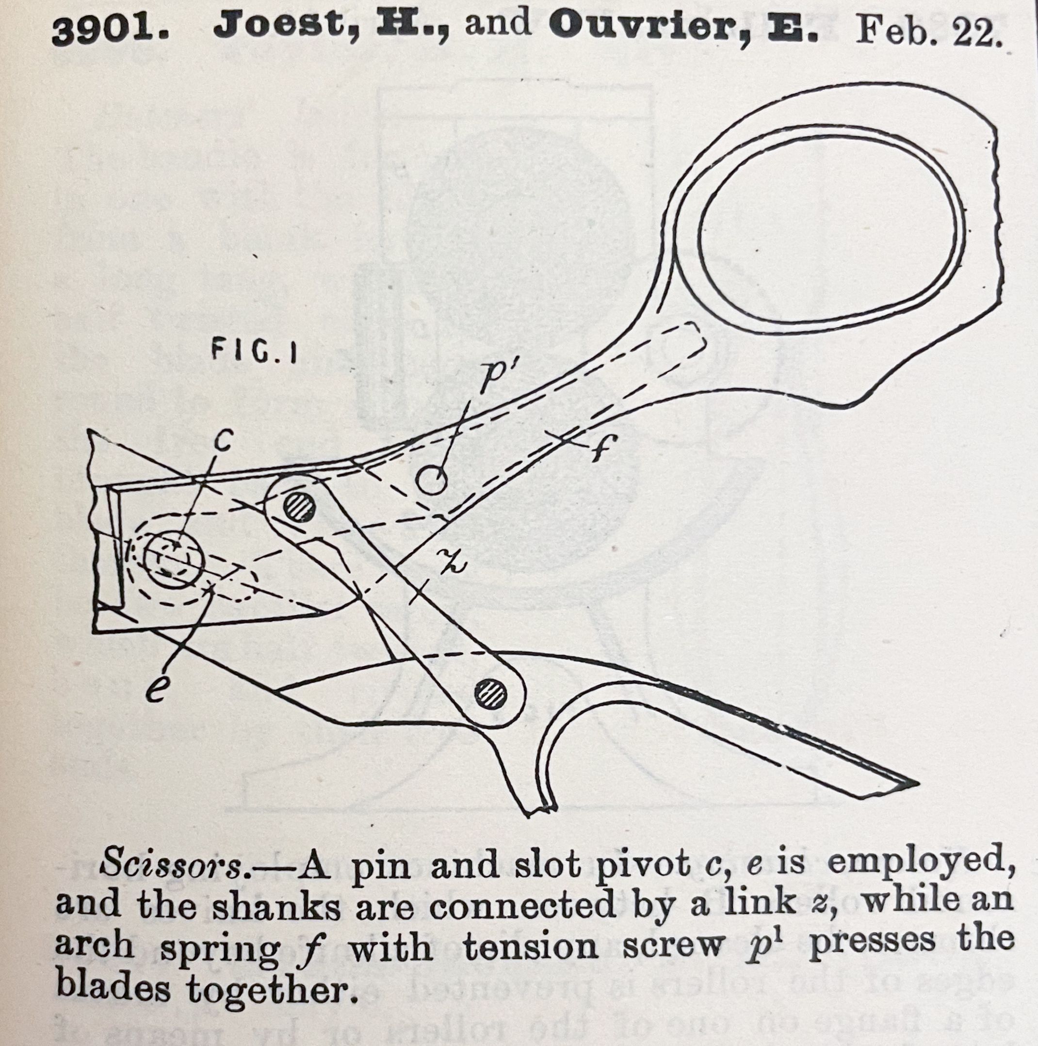Scissors. -- A pin and slot pivot c, e is employed, and the shanks are connected by a link z, while an arch spring f with tension screw p1 presses the blades together.Cataloged By