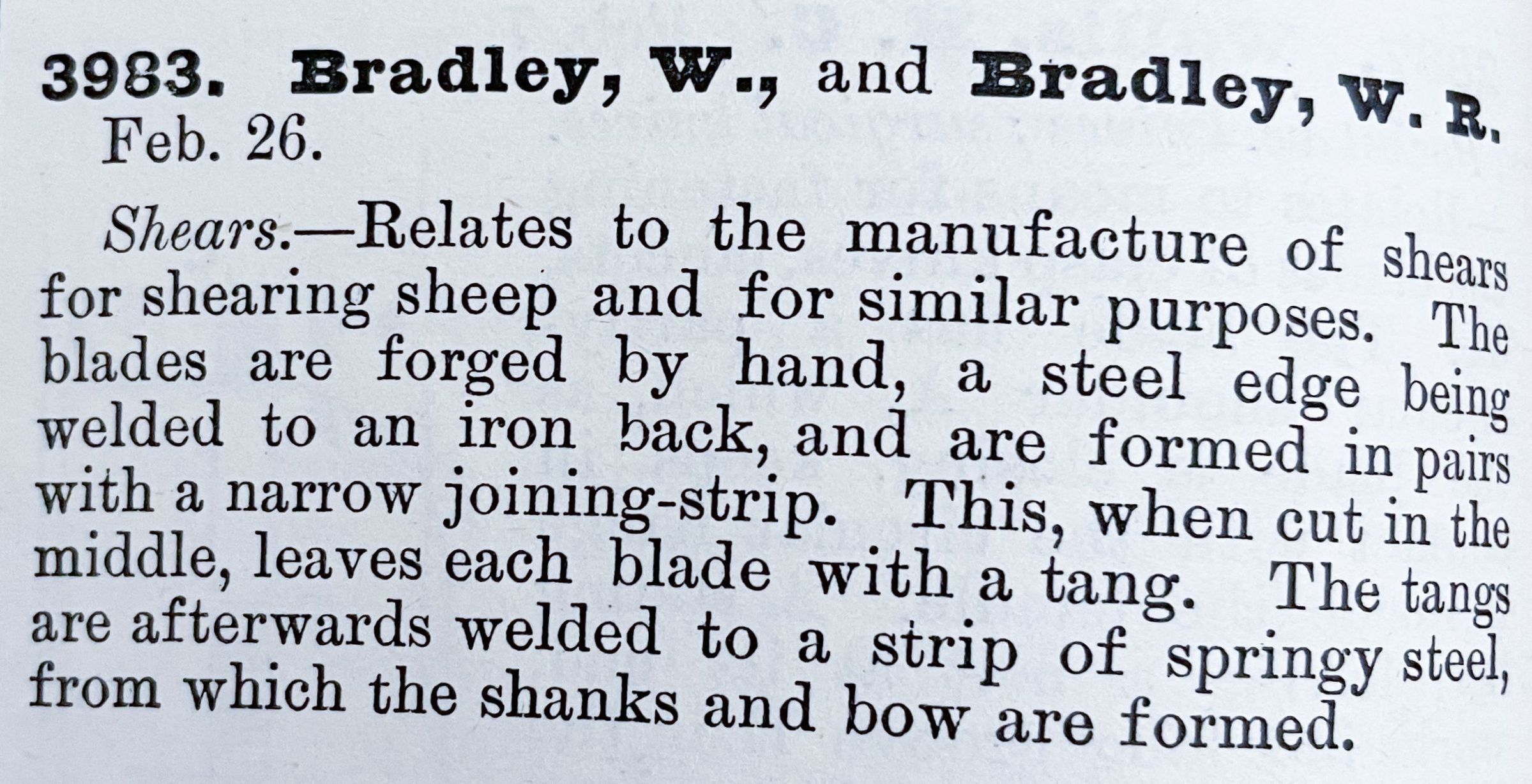 Shears. -- Relates to the manufacture of shears for shearing sheep and for similar purposes. The blades are forged by hand, a steel edge being welded to an iron back, and are formed in pairs with a narrow joining-strip. This, when cut in the middle, leaves each blade with a tang. The tangs are afterwards welded to a strip of springy steel, from which the shanks and bow are formed.Cataloged By