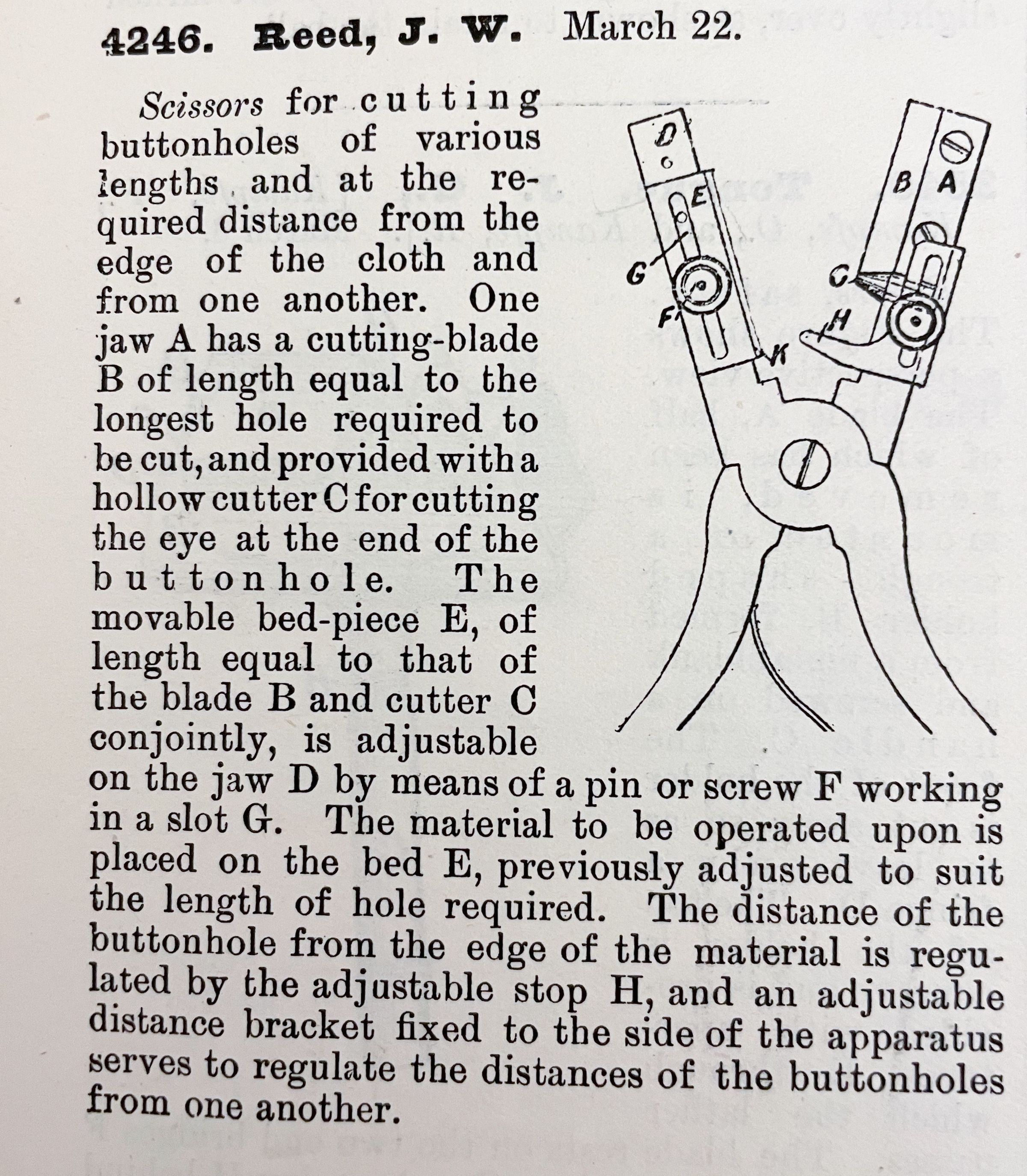 Scissors for cutting buttonholes of various lengths and at the required distance from the edge of the cloth and from one another. One jaw A has a cutting-blade B of length equal to the longest hole required to be cut, and provided with a hollow cutter C for cutting the eye at the end of the buttonhole. The movable bed-piece E, of length equal to that of the blades B and cutter C conjointly, is adjustable on the jaw D by means of a pin or screw F working in a slot G. The material to be operated upon is placed on the bed E, previously adjusted to suit the length of hole required. The distance of the buttonhole from the edge of the material is regulated by the adjustable stop H, and an adjustable distance bracket fixed to the side of the apparatus serves to regulate the distances of the buttonholes from one another.Cataloged By