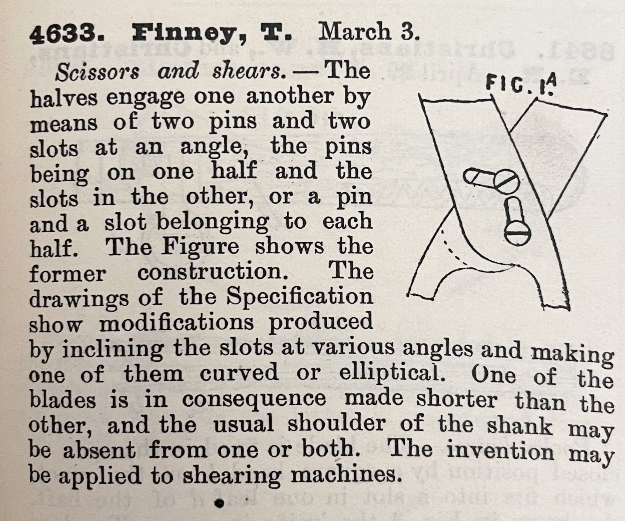Scissors and shears. -- The halves engage one another by means of two pins and two slots at an angle, the pins being on one half and the slots in the other, or a pin and a slot belonging to each half. The Figure shows the former construction. The drawings of the Specification show modifications produced by inclining the slots at various angles and making one of them curved or elliptical. On of the blades is in consequence made shorter than the other, and the usual shoulder of the shank may be absent from one or both. The invention may be applied to shearing machines.Cataloged By