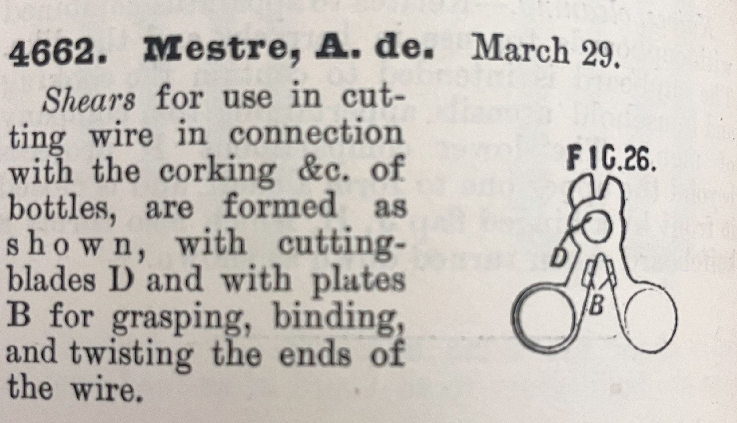 Shears for use in cutting wire in connection with the corking &c. of bottles, are formed as shown, with cutting-blades D and with plates B for grasping, binding, and twisting the ends of the wire.Cataloged By