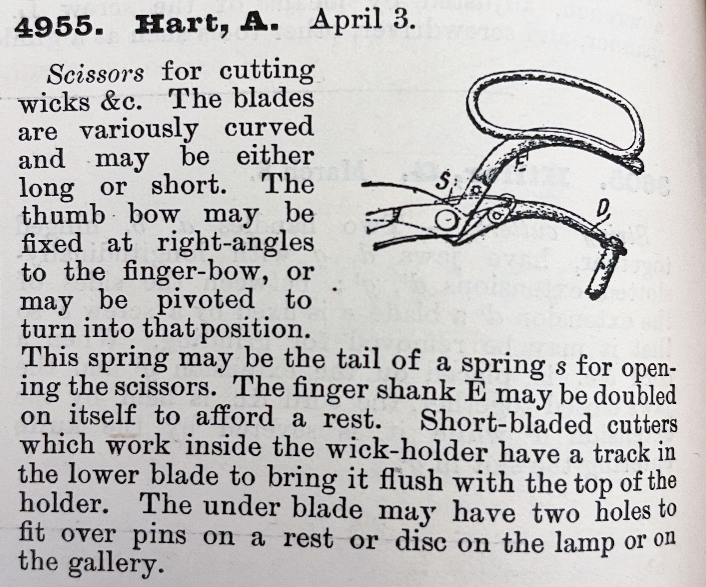 Scissors for cutting wicks, &c. The blades are variously curved and may be either long or short. The thumb bow may be fixed at right-angles to the finger-bow, or may be pivoted to turn into that position. This spring may be the tail of a spring s for opening the scissors. The finger shank E may be doubled on itself to afford a rest. Short-bladed cutters which work inside the wick-holder have a track in the lower blade to bring it flush with the top of the holder. The under blade may have two holes to fit over pins on a rest of disc on the lamp or on the gallery.Cataloged By