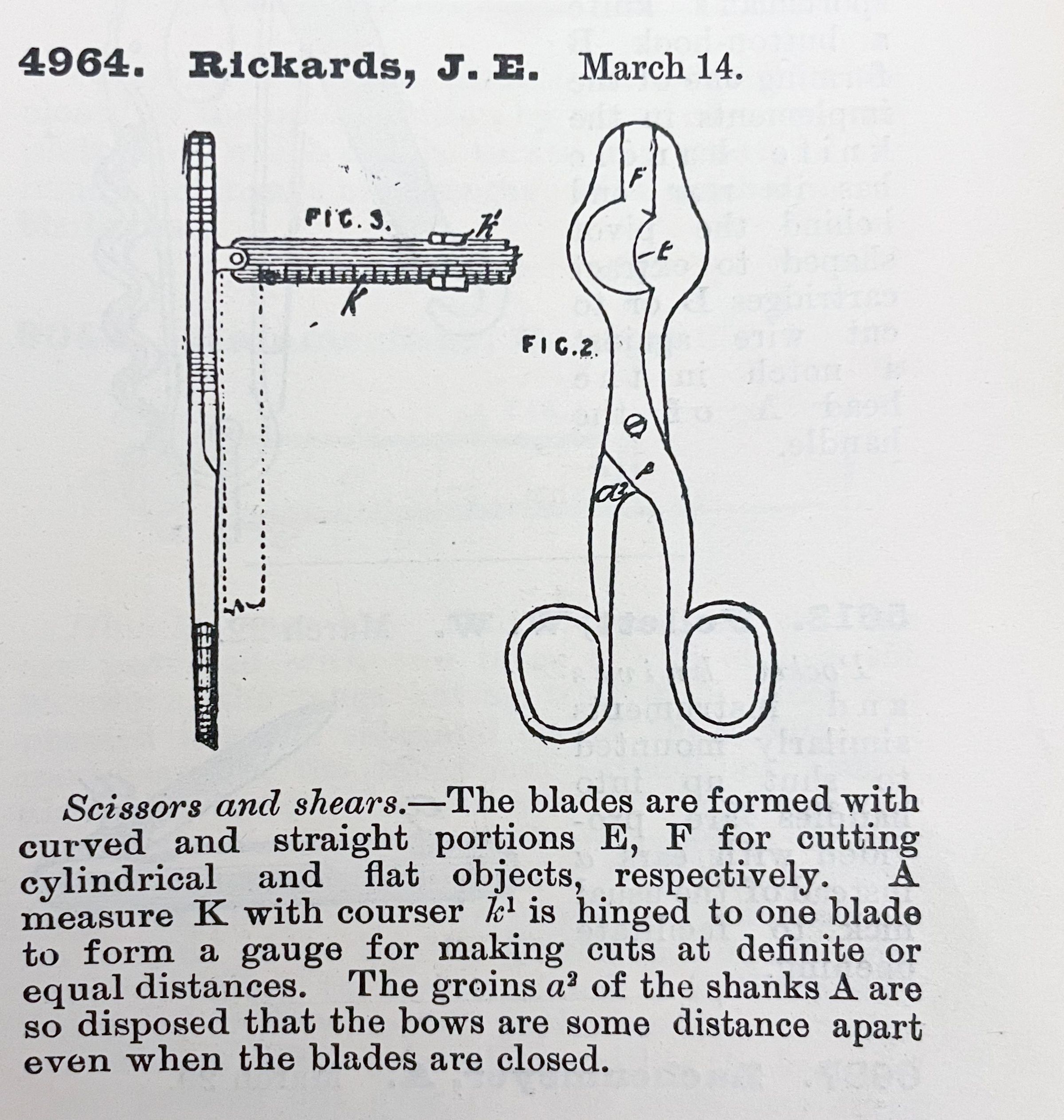 Scissors and shears. -- The blades are formed with curved and straight portions E, F for cutting cylindrical and flat objects, respectively. A measure K with courser k1 is hinged to one blade to form a gauge for making cuts at definite or equal distances. The groins a2 of the shanks A are so disposed that the bows are some distance apart even when the blades are closed.Cataloged By