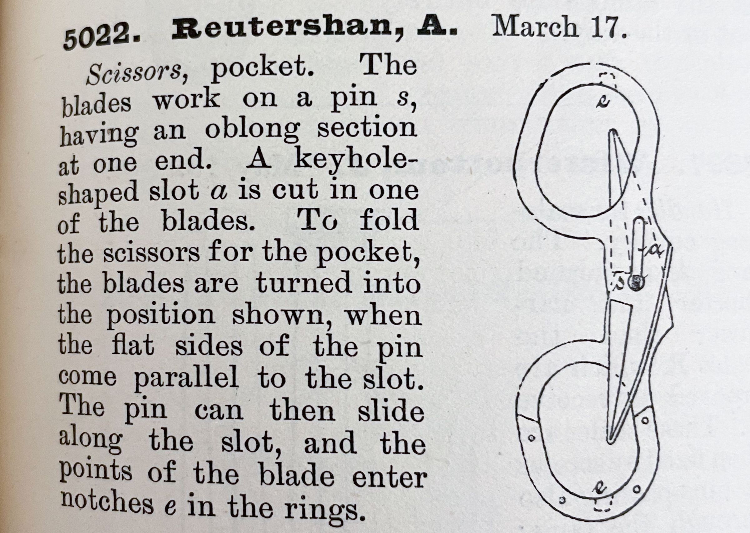 Scissors, pocket. The blades work on a pin s, having an oblong section at one end. A keyhole-shaped slot a is cut in one of the blades. To fold the scissors for the pocket, the blades are turned into the position shown, when the flat sides of the pin come parallel to the slot. The pin can then slide along the slot, and the points of the blade enter notches e in the rings.Cataloged By