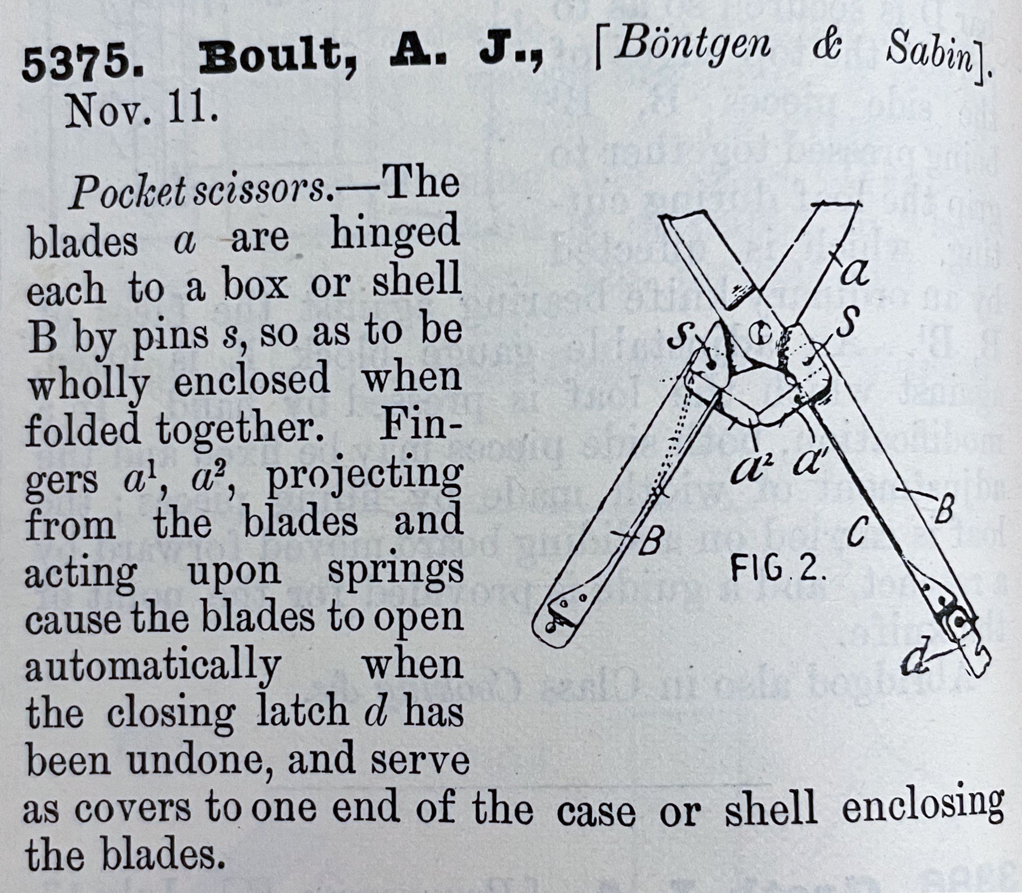 Pocket scissors. -- The blades an are hinged each to a box or shell B by pins s, so as to be wholly enclosed when folded together. Fingers a1, a2, projecting from the blades and acting upon springs cause the blades to open automatically when the closing latch d has been undone, and serve as covers to one end of the case or shell enclosing the blades.Cataloged By