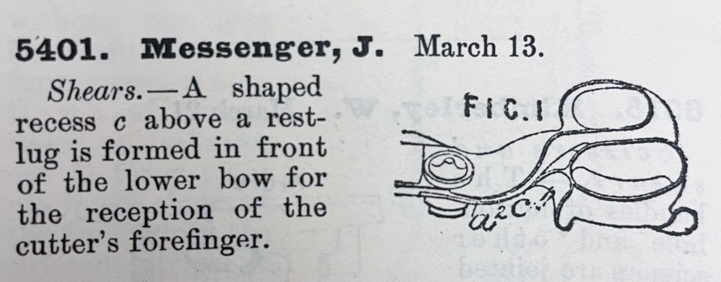 Shears. -- A shaped recess c above a rest-lug is formed in front of the lower bow for the reception of the cutter's forefinger.Cataloged By