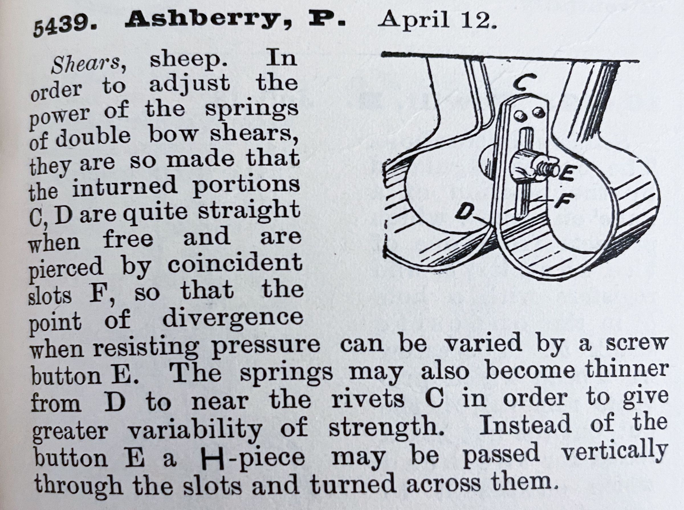 Shears, sheep. In order to adjust the power of the springs of double bow shears, they are so made that the inturned portions C, D are quite straight when free and are pierced by coincident slots F, so that the point of divergence when resisting pressure can be varied by a screw button E. The springs may also become thinner from D to near the rivets C in order to give greater variability of strength. Instead of the button E a H-piece may be passed vertically through the slots and turned across them.Cataloged By