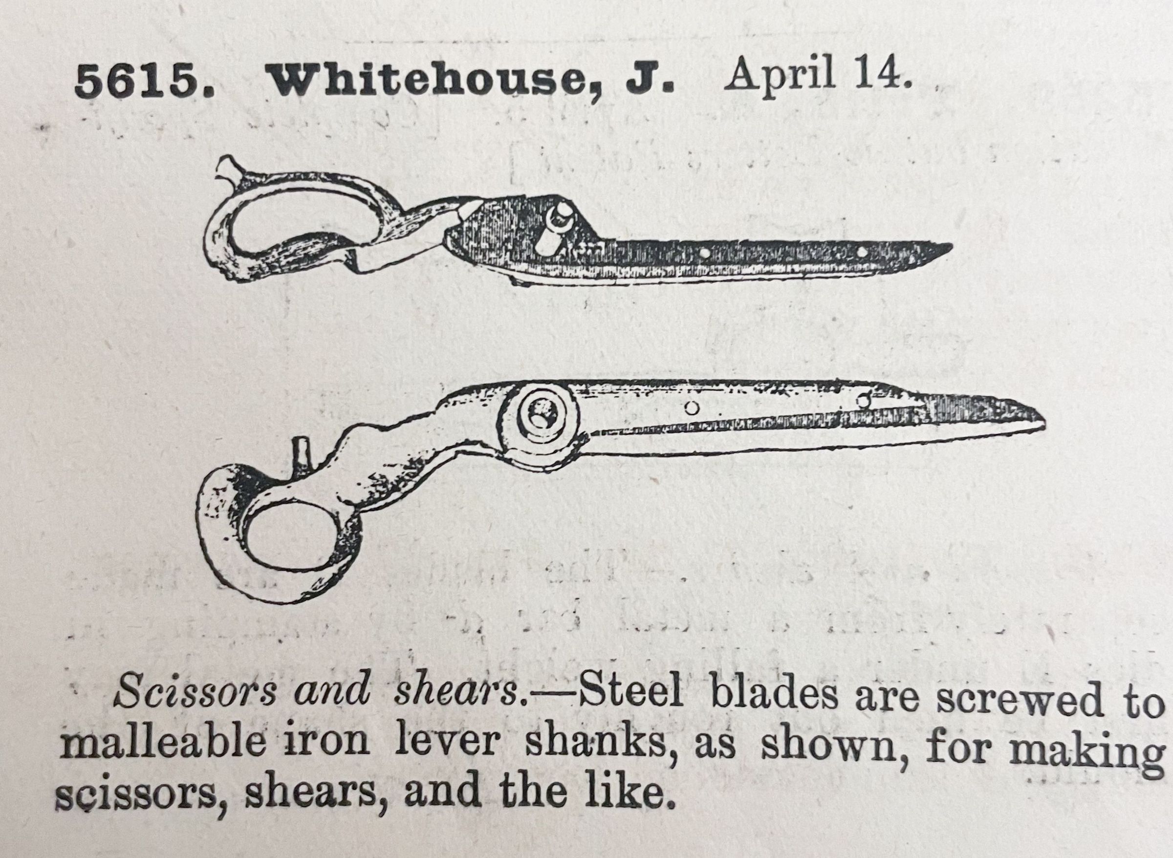 Scissors and shears. -- Steel blades are screwed to malleable iron lever shanks, as shown, for making scissors, shears, and the like.Cataloged By