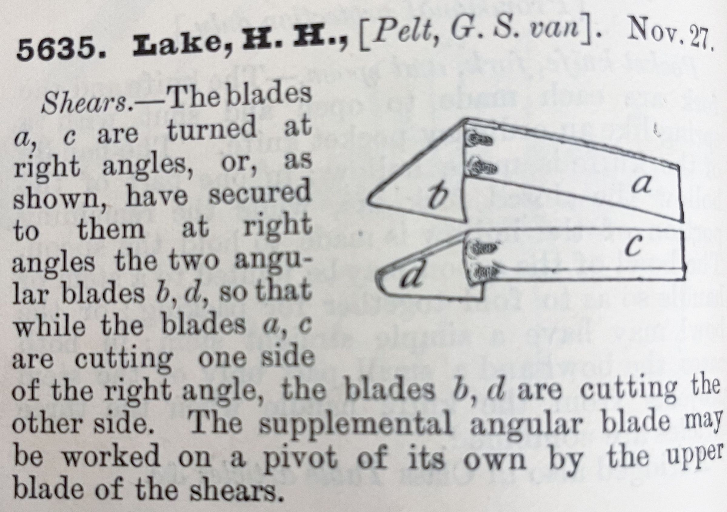 Shears. -- The blades a, c are turned at right angles, or, as shown, have secured to them at right angles the two angular blades b, d, so that while the blades a, c are cutting one side of the right angle, the blades b, d are cutting the other side. The supplemental angular blade may be worked on a pivot of its own by the upper blade of the shears.Cataloged By