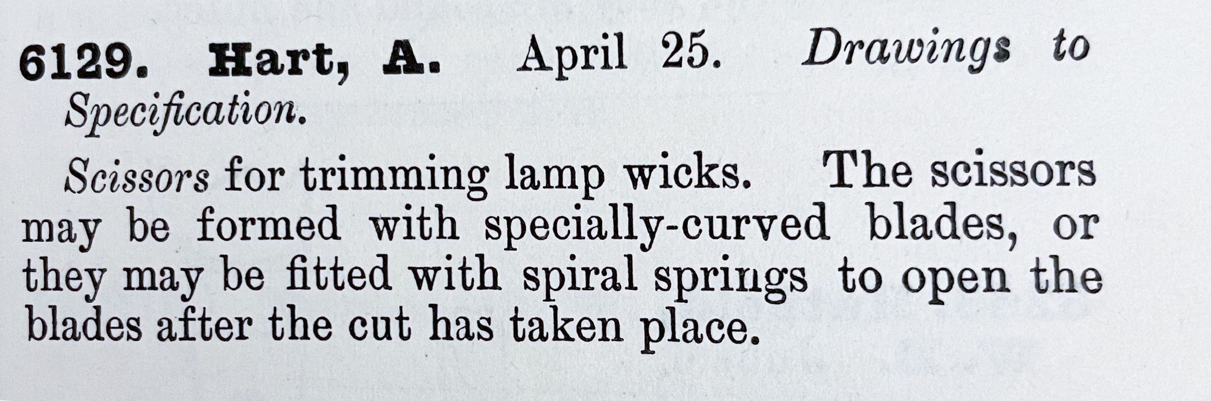 Scissors for trimming lamp wicks. The scissors may be formed with specially-curved blades, or they may be fitted with spiral springs to open the blades after the cut has taken place.Cataloged By