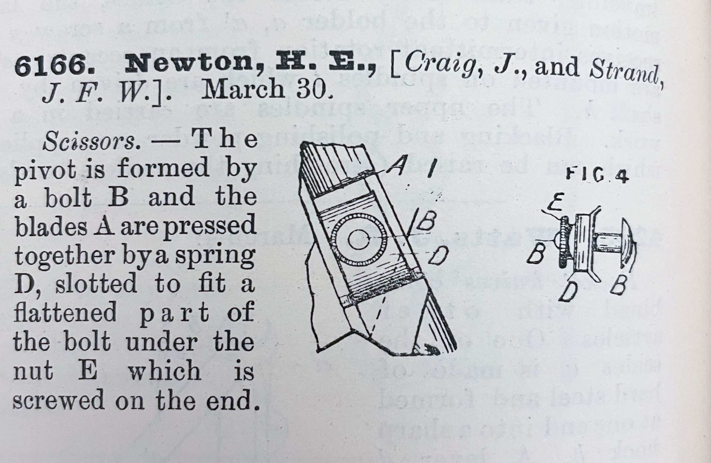 Scissors. -- The pivot is formed by a bolt B and the blades A are pressed together by a spring D, slotted to fit a flattened part of the bolt under the nut E which is screwed on the end.Cataloged By