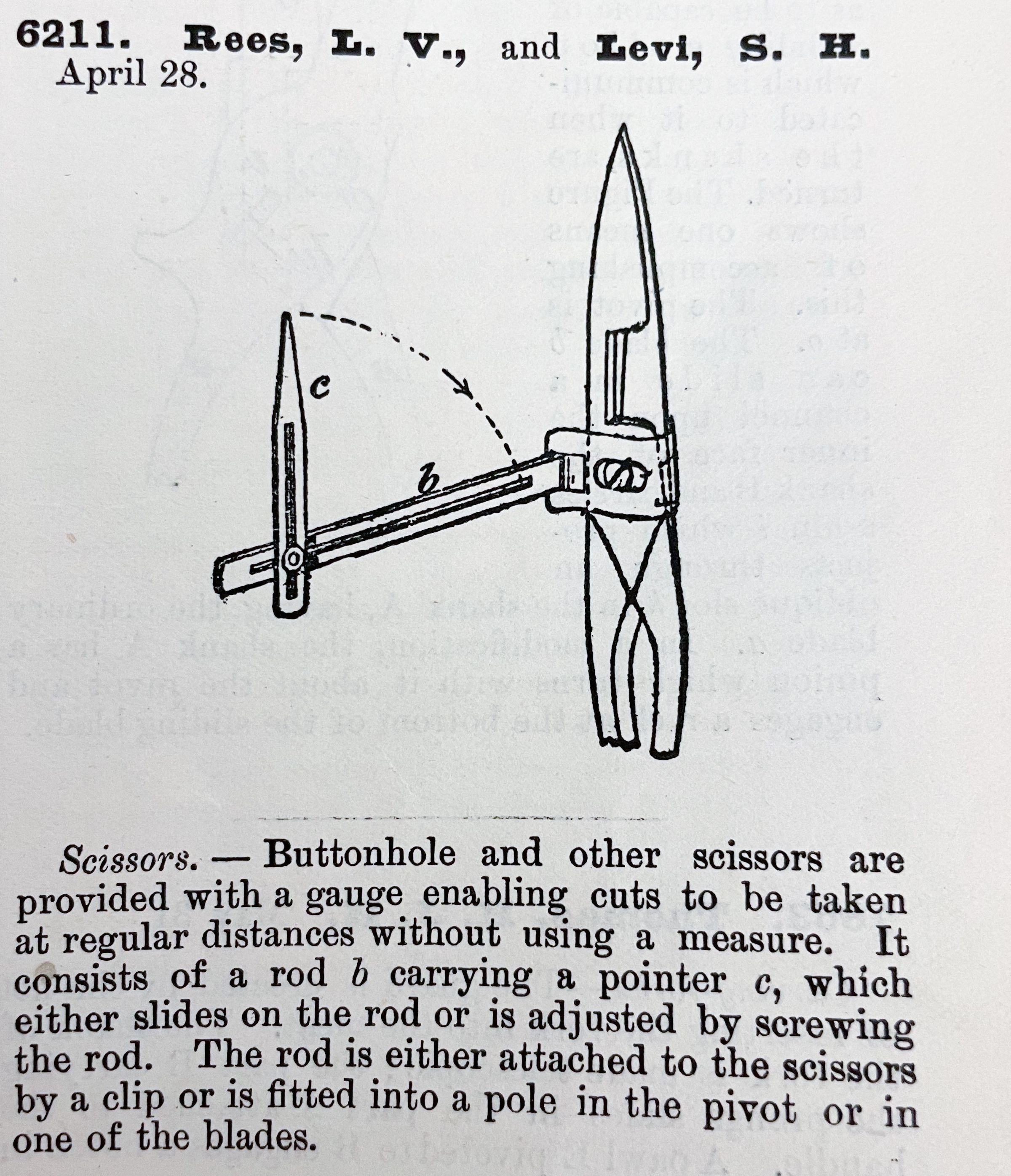 Scissors. -- Buttonhole and other scissors are provided with a gauge enabling cuts to be taken at regular distances without using a measure. It consists of a rod b carrying a pointer c, which either slides on the rod or is adjusted by screwing the rod. The rod is either attached to the scissors by a clip or is fitted into a pole in the pivot or in one of the blades.Cataloged By