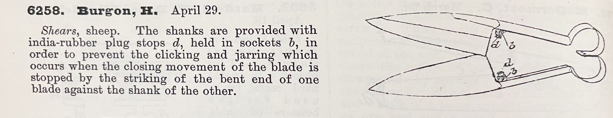 Shears, sheep. The shanks are provided with India-rubber plug stops d, held in sockets b, in order to prevent the clicking and jarring which occurs when the closing movement of the blade is stopped by the striking of the bent end of one blade against the shank of the other.Cataloged By