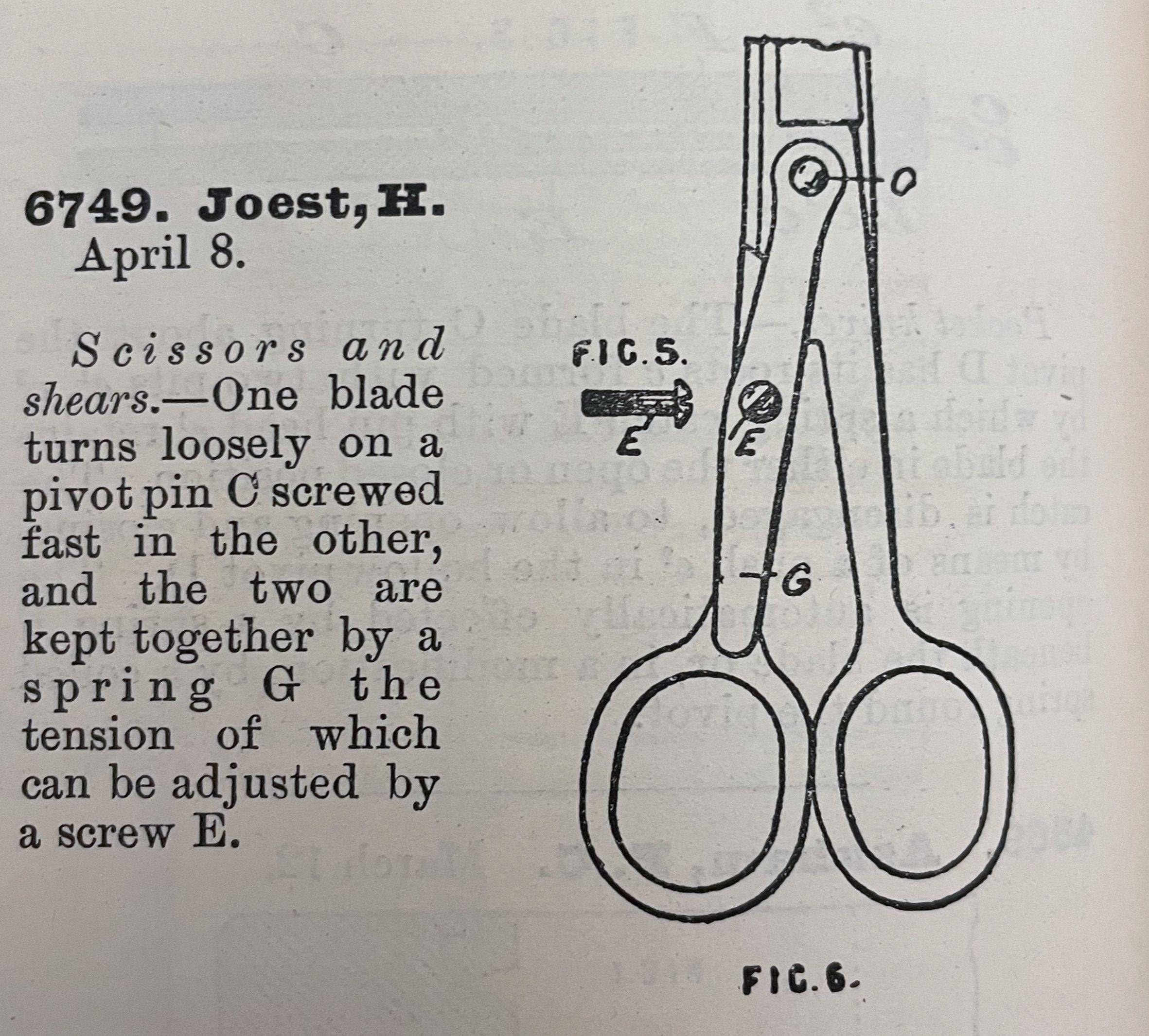 Scissors and shears. -- One blade turns loosely on a pivot pin C screwed fast in the other, and the two are kept together by a spring G the tension of which can be adjusted by a screw E.Cataloged By