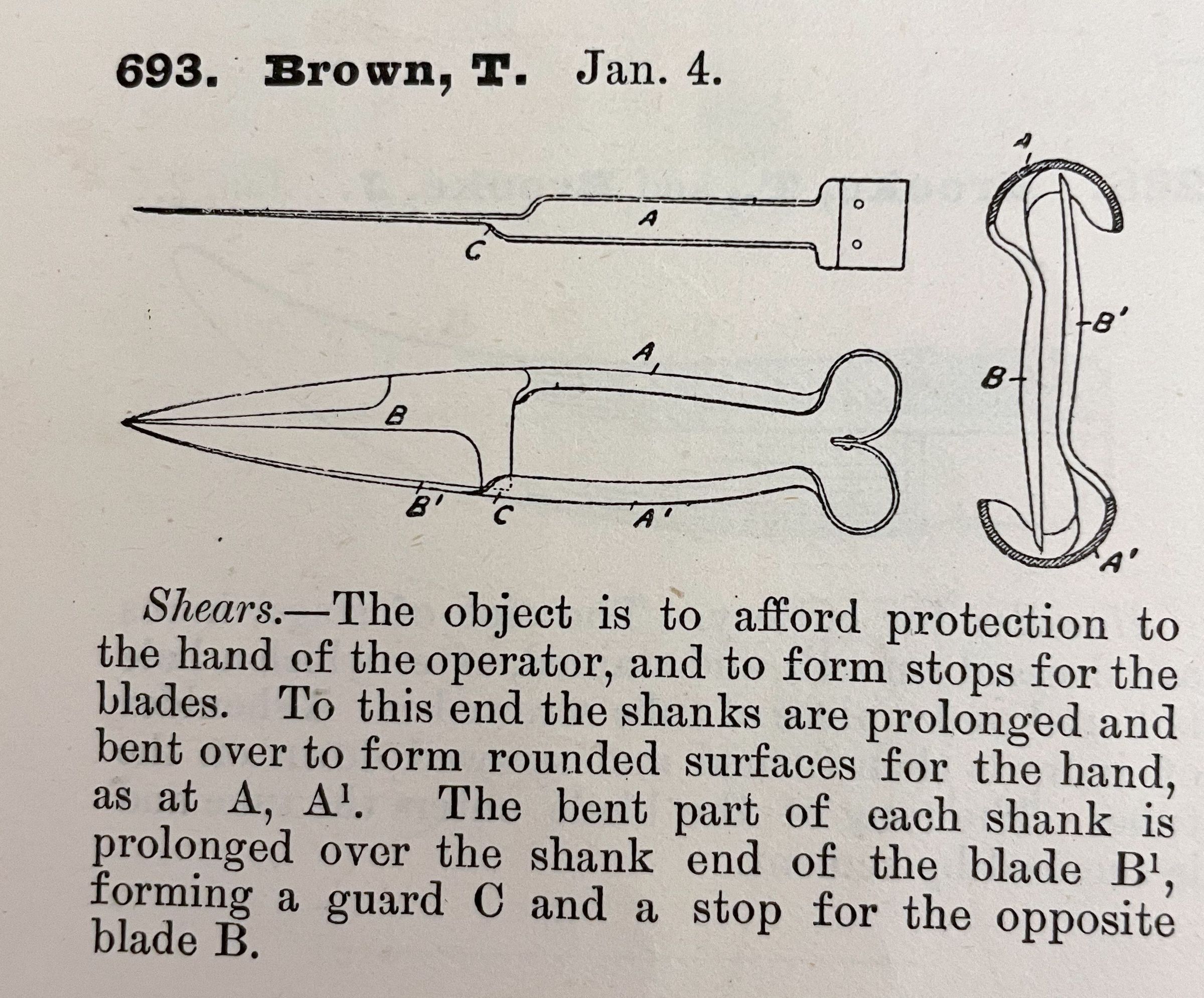 Shears. -- The object is to afford protection to the hand of the operator, and to form stops for the blades. To this end the shanks are prolonged and bent over to form rounded surfaces for the hand, as at A, A1. The bent part of each shank is prolonged over the shank end of the blade B1, forming a guard C and a stop for the opposite blade B.Cataloged By