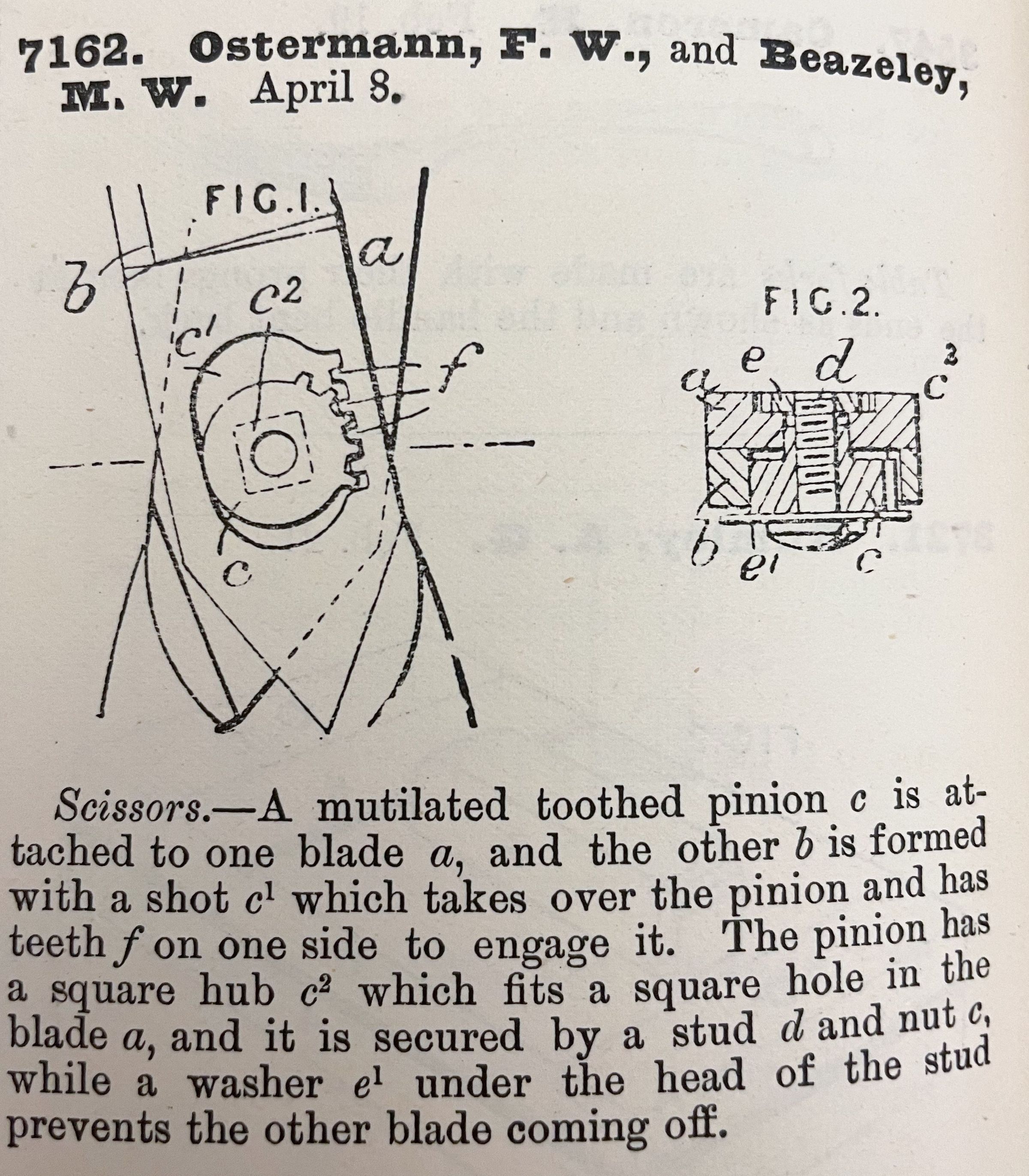 Scissors. -- A mutilated toothed pinion c is attached to one blade a, and the other b is formed with a shot c1 which takes over the pinion and has teeth f on one side to engage it. The pinion has a square hub c2 which fits a square hole in the blade a, and it is secured by a stud d and nut c, while a washer e1 under the head of the stud prevents the other blade coming off.Cataloged By