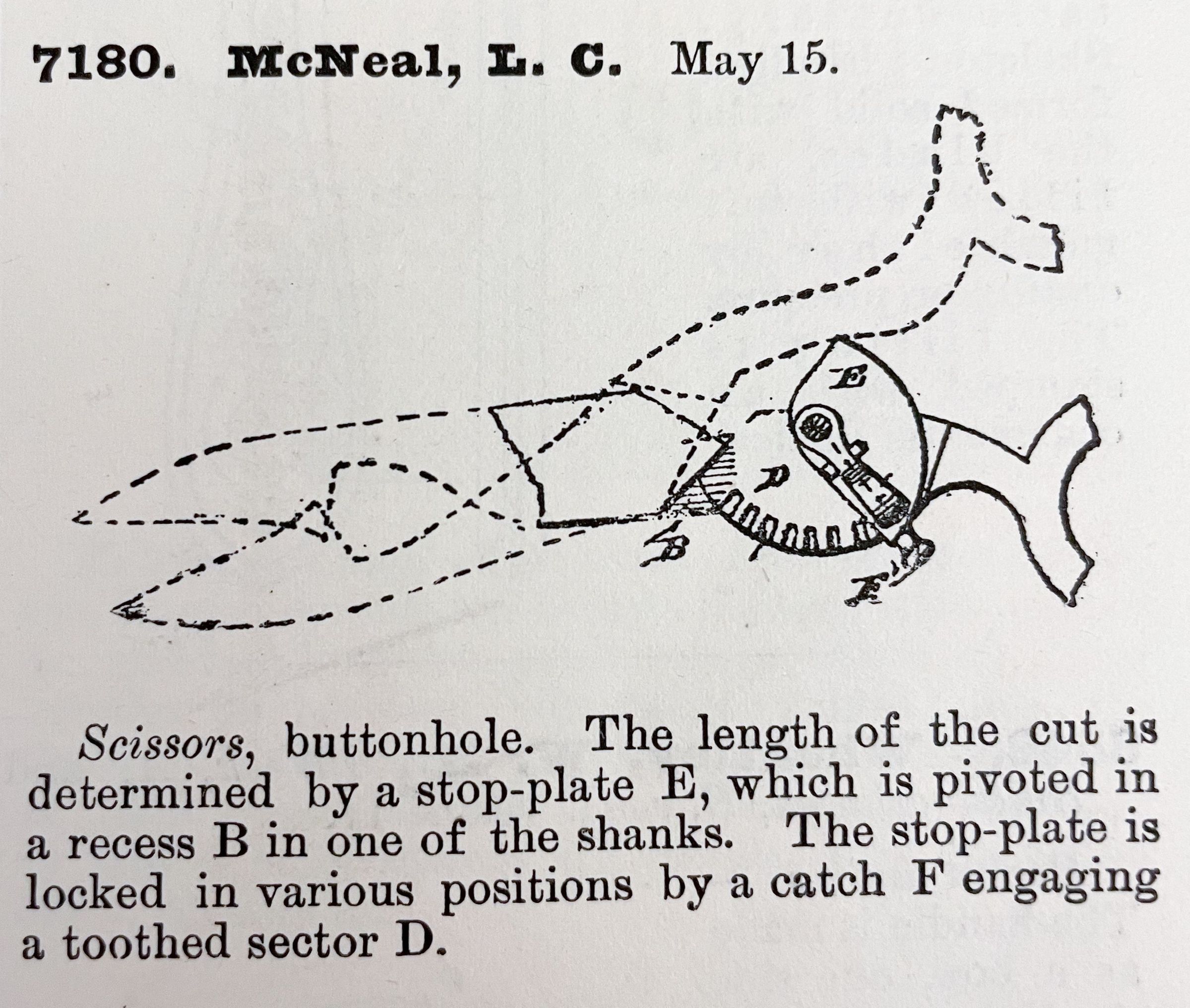 Scissors, buttonhole. The length of the cut is determined by a stop-plate E, which is pivoted in a recess B in one of the shanks. The stop-plate is locked in various positions by a catch F engaging a toothed sector D.Cataloged By