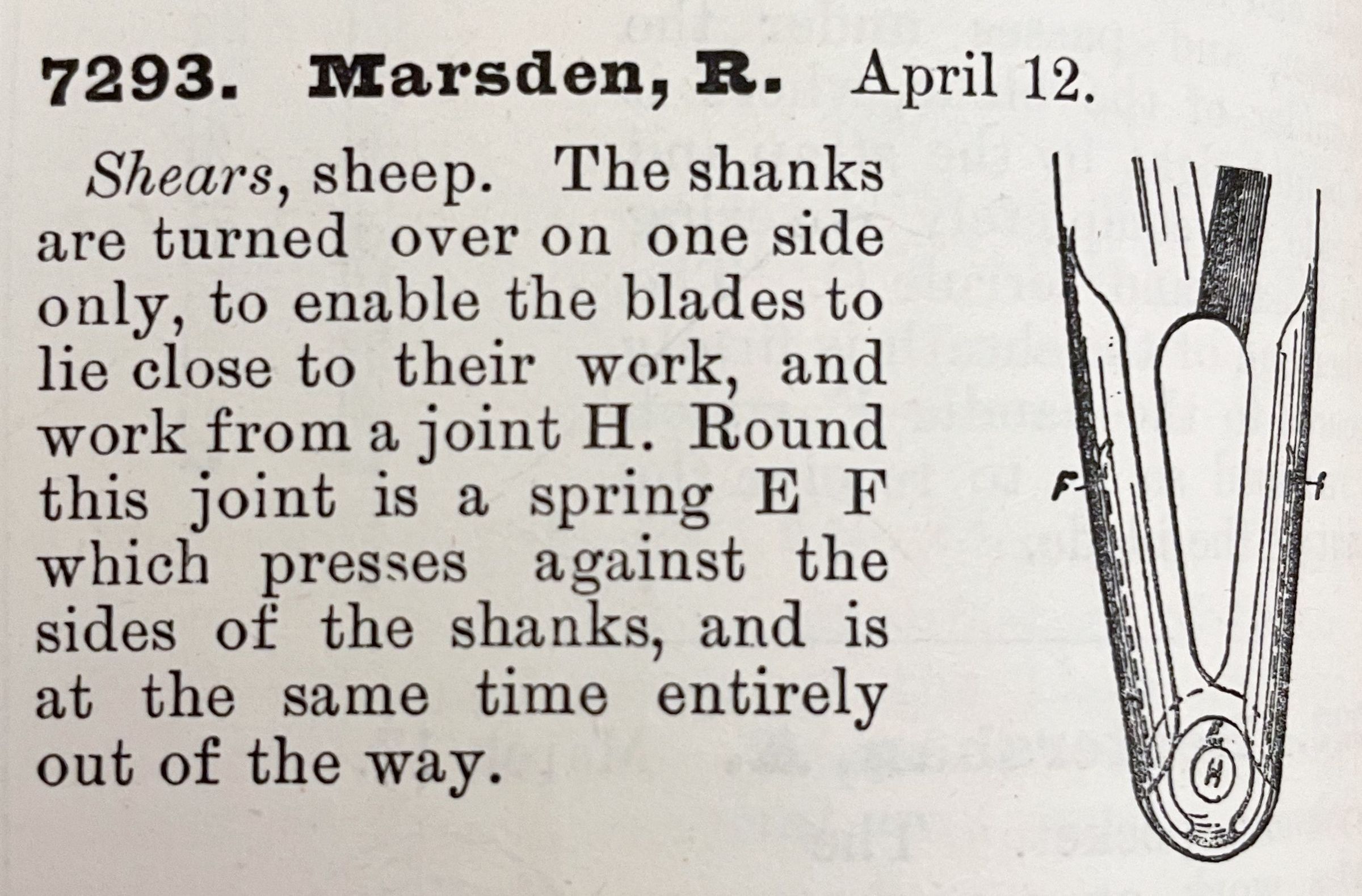 Shears, sheep. The shanks are turned over on one side only, to enable the blades to lie close to their work, and work from a joint H. Round this joint is a spring E F which presses against the sides of the shanks, and is at the same time entirely out of the way.Cataloged By