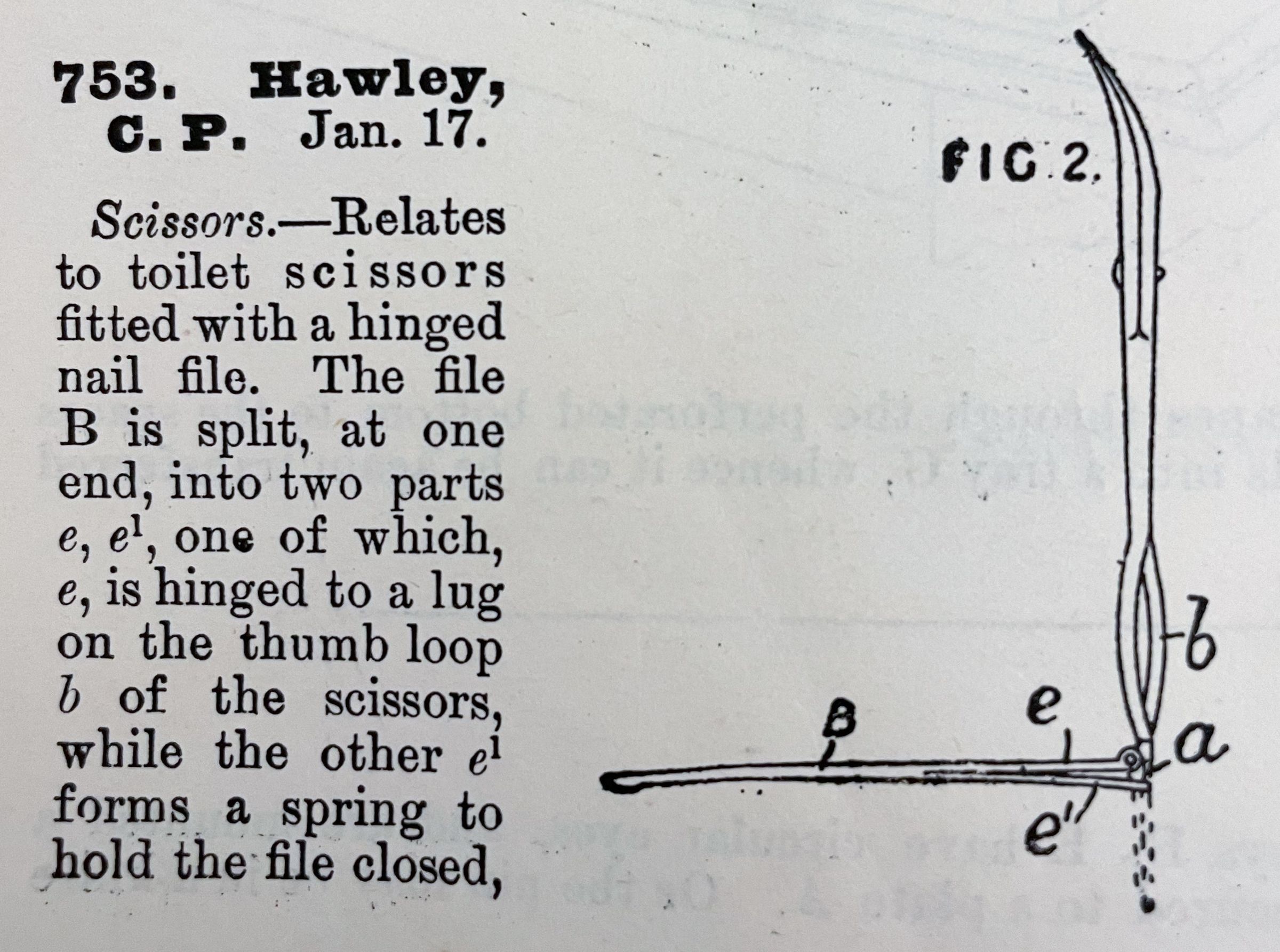 Scissors. -- Relates to toilet scissors fitted with a hinged nail file. The file B is split, at one end, into two parts e, e1, one of which, e, is hinged to a lug on the thumb loop b, of the scissors, while the other e1 forms a spring to hold the file closed, [incomplete?].Cataloged By