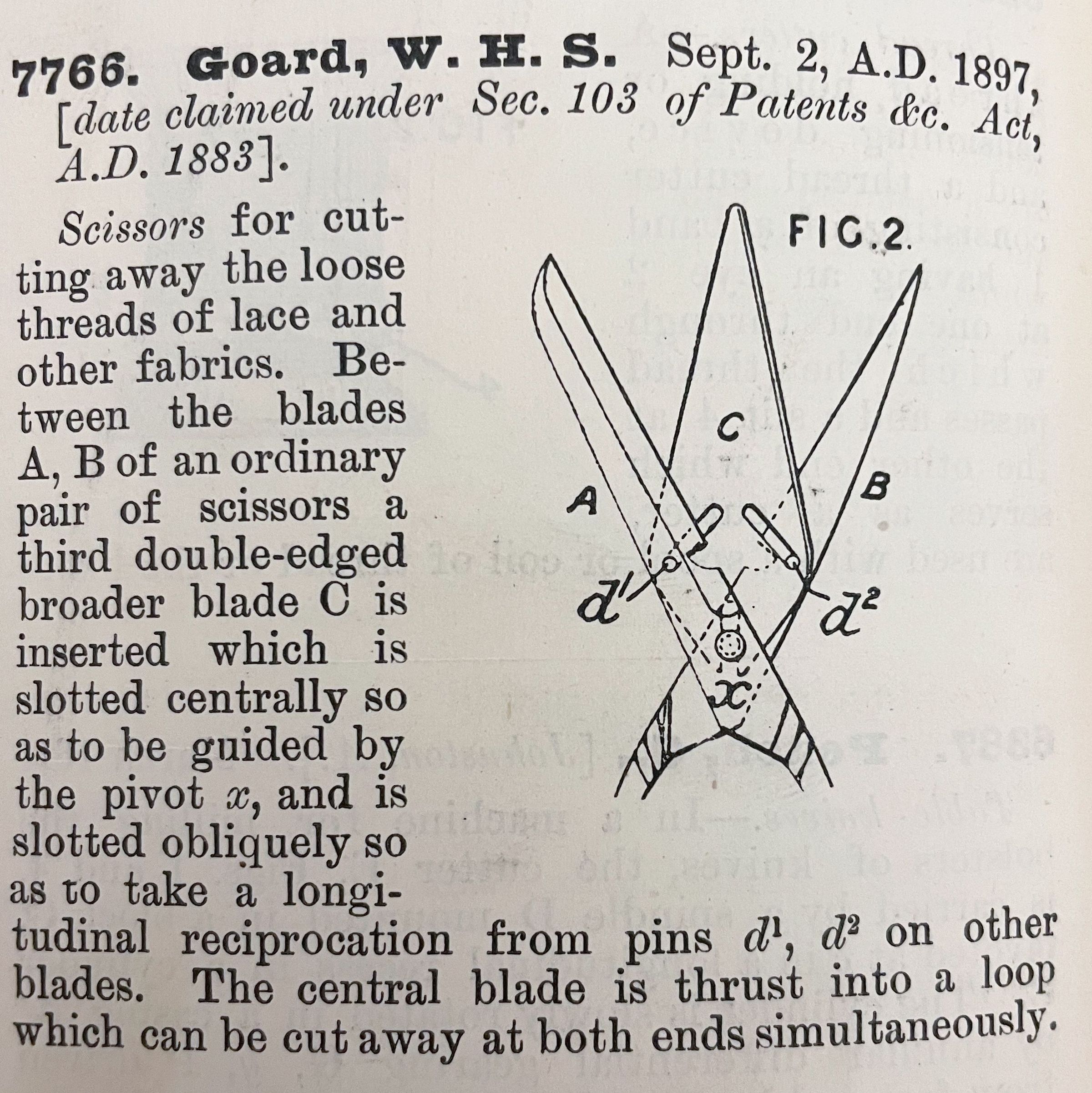 Scissors for cutting away the loose threads of lace and other fabrics. Between the blades A, B of an ordinary pair of scissors a third double-edged broader blade C is inserted which is slotted centrally so as to be guided by the pivot x, and is slotted obliquely so as to take a longitudinal reciprocation from pins d1, d2 on other blades. The central blade is thrust into a loop which can be cut away at both ends simultaneously.Cataloged By