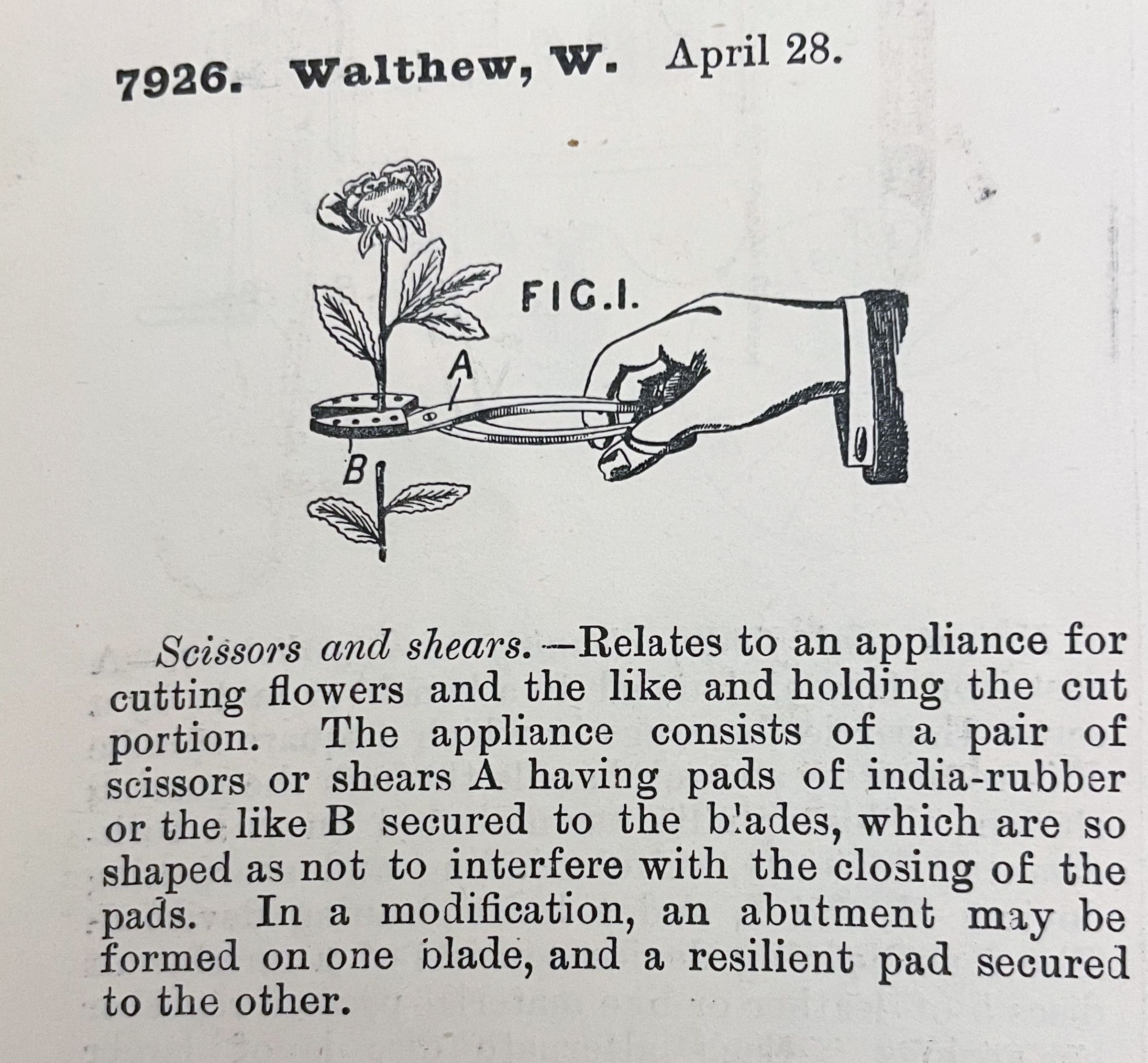 Scissors and shears. -- Relates to an appliance for cutting flowers and the like and holding the cut portion. The appliance consists of a pair of scissors or shears A having pads of India-rubber or the like B secured to the blades, which are so shaped as not to interfere with the closing of the pads. In a modification, an abutment may be formed on one blade, and a resilient pad secured to the other.Cataloged By