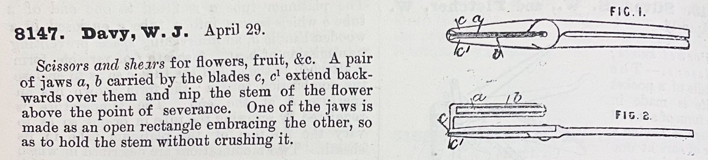 Scissors and shears for flowers, fruit, &c. A pair of jaws a, b carried by the blades c, c1 extend backwards over them and nip the stem of the flower above the point of severance. One of the jaws is made as an open rectangle embracing the other, so as to hold the stem without crushing it.Cataloged By