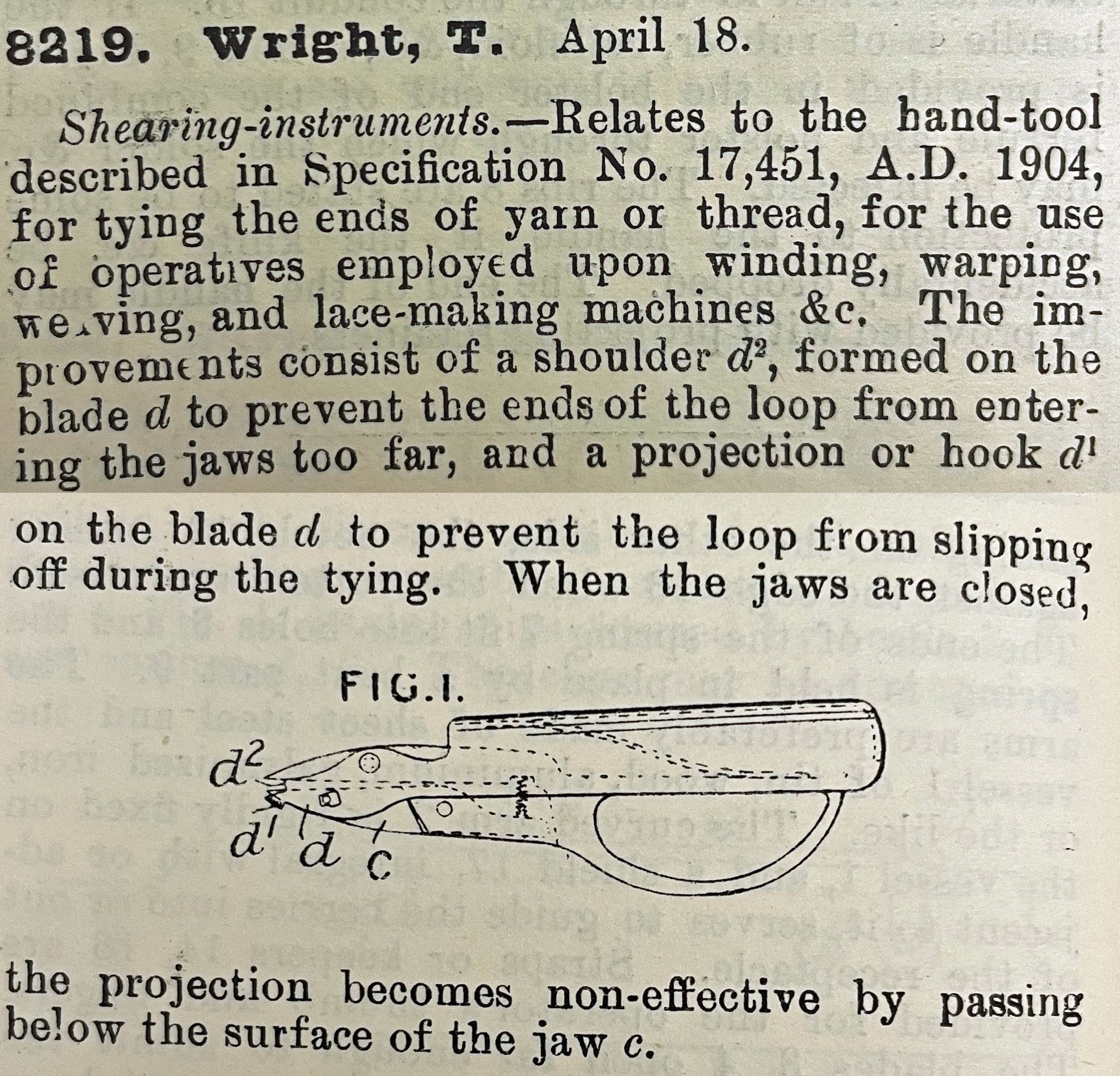 Shearing-instruments. -- Relates to the hand-tool described in Specification No. 17,451, A.D. 1904, for tying the ends of yarn or thread, for the use of operatives employed upon winding, warping, weaving, and lace-making machines &c. The improvements consist of a shoulder d2, formed on the blade d to prevent the ends of the loop from entering the jaws too far, and a projection or hook d1 on the blade d to prevent the loop from slipping off during the tying. When the jaws are closed, the projection becomes non-effective by passing below the surface of the jaw c.Cataloged By