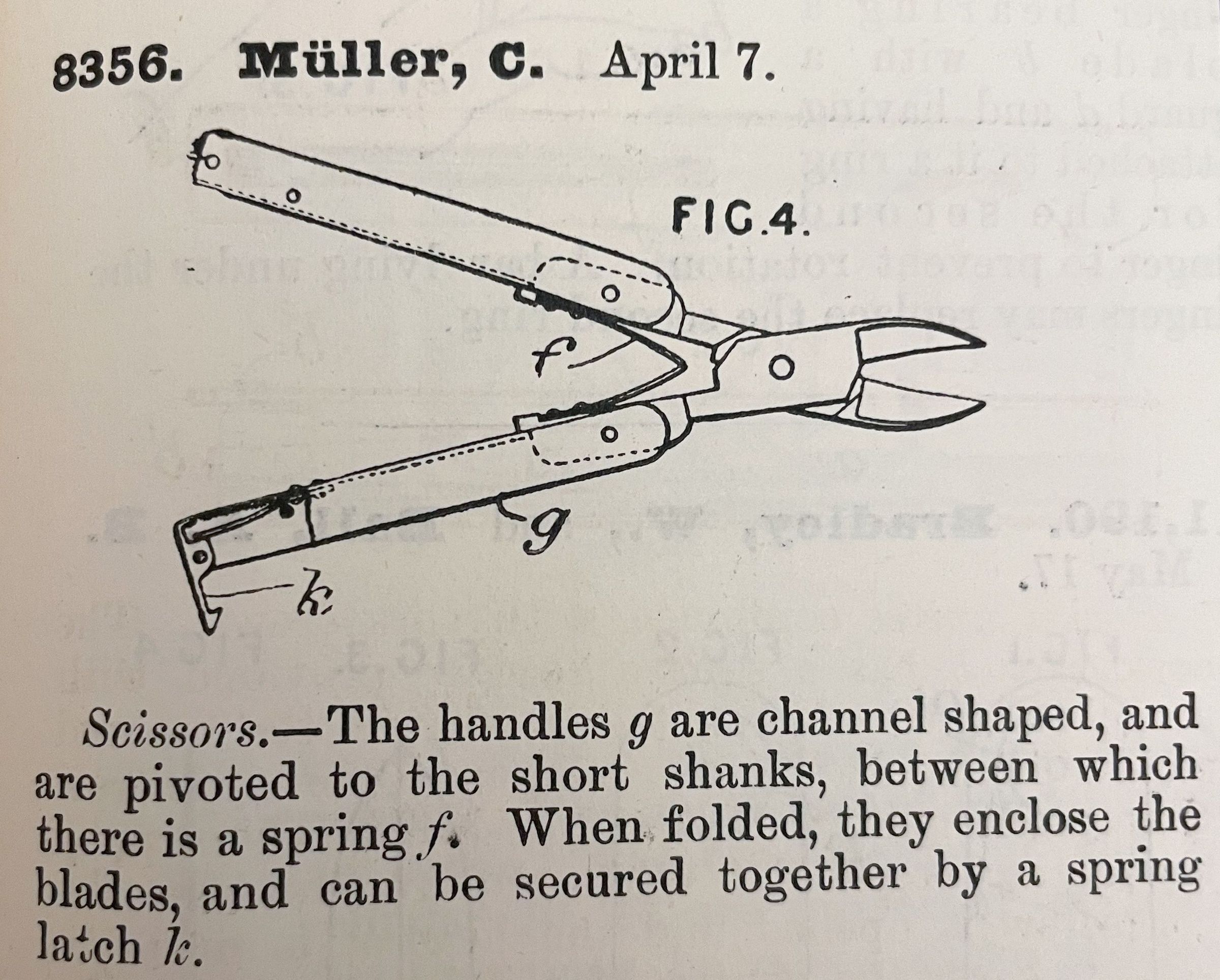 Scissors. -- The handles g are channel shaped, and are pivoted to the short shanks, between which there is a spring f. When folded, they enclose the blades, and can be secured together by a spring latch k.Cataloged By