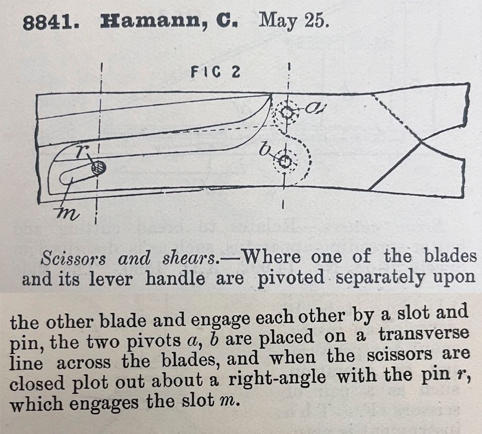 Scissors and shears. -- Where one of the blades and its lever handle are pivoted separately upon the other blade and engage each other by a slot and pin, the two pivots a, b are placed on a transverse line across the blades, and when the scissors are closed plot out about a right-angle with the pin r, which engages the slot m.Cataloged By