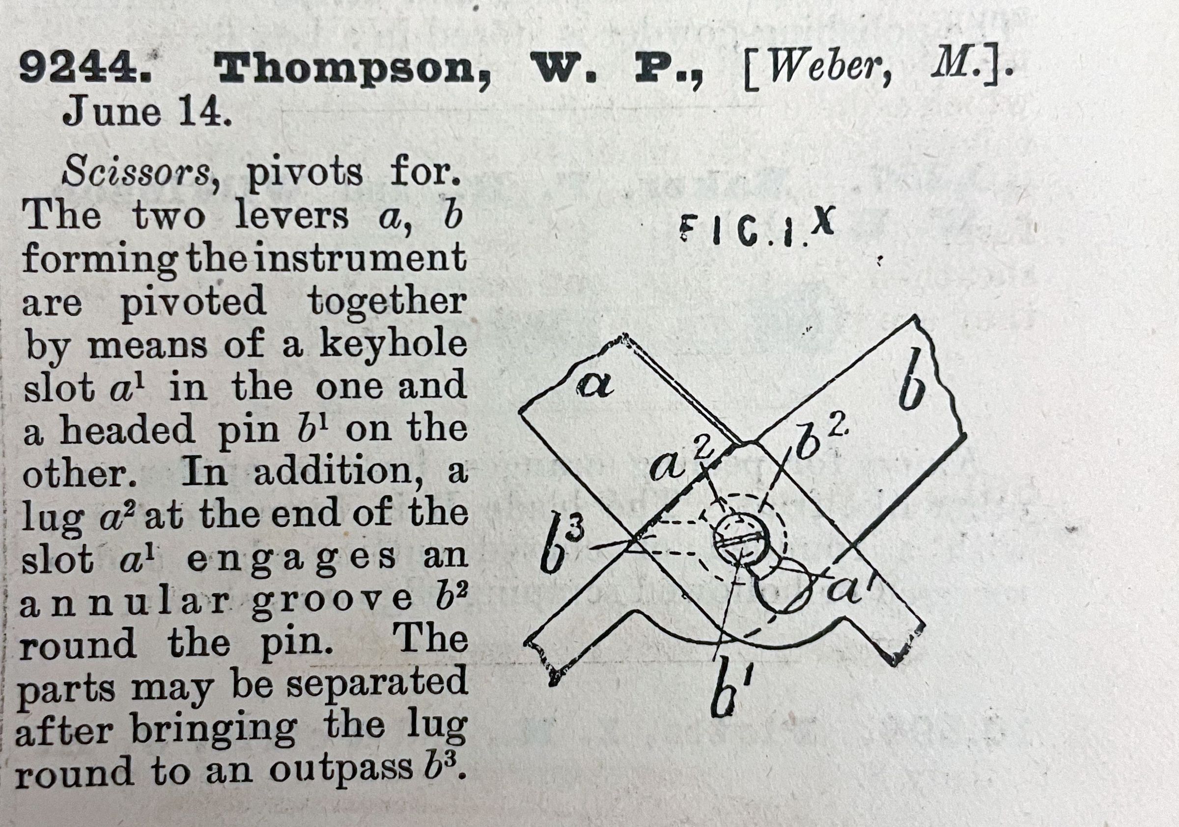 Scissors, pivots for. The two levers a, b forming the instrument are pivoted together by means of a keyhole slot a1 in the one and a headed pin b1 on the other. In addition, a lug a2 at the end of the slot a1 engages an annular groove b2 round the pin. The parts may be separated after bringing the lug round to an outpost b3.Cataloged By