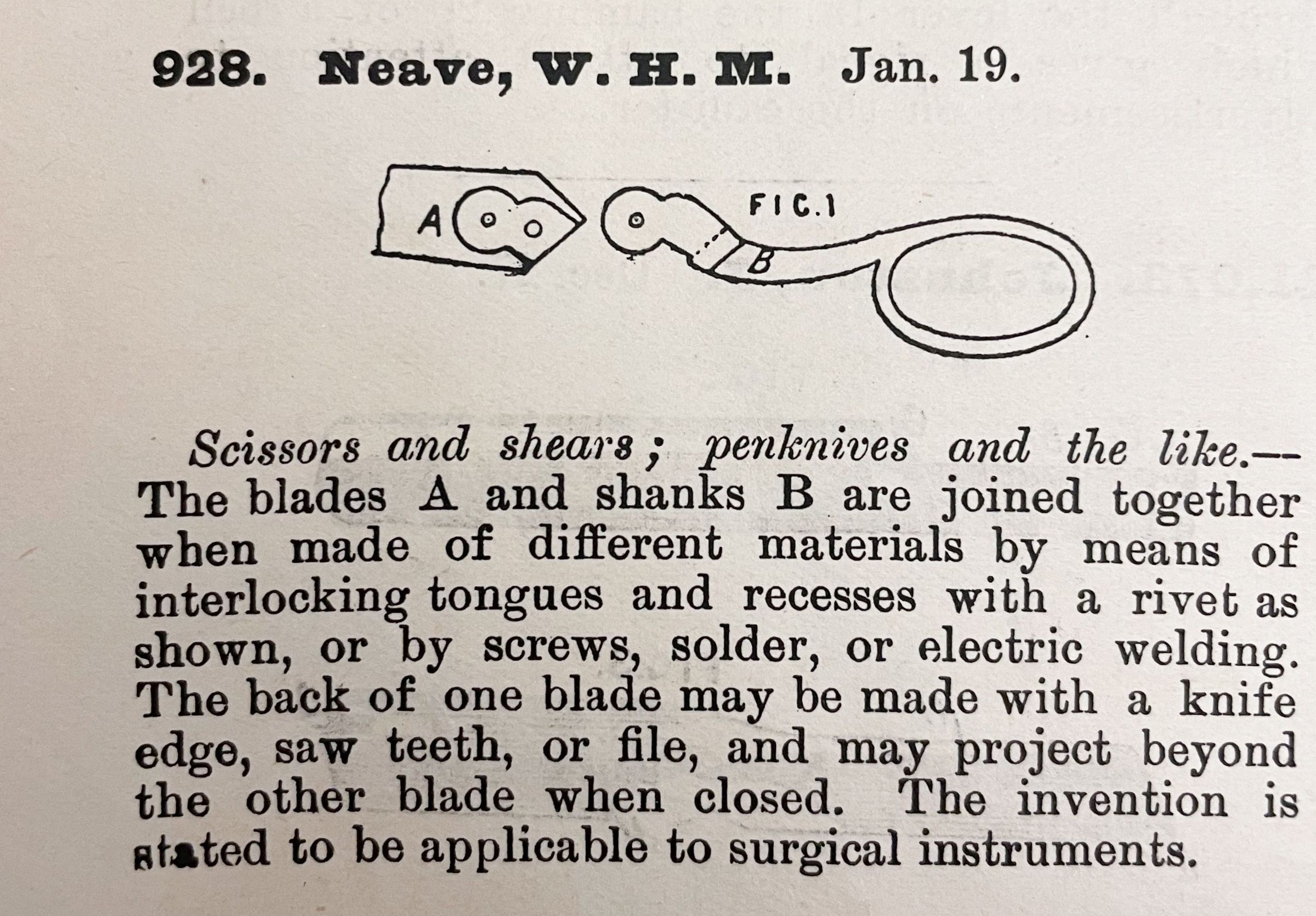 Scissors and shears; penknives and the like. -- The blades A and shanks B are joined together when made of different materials by means of interlocking tongues and recesses with a rivet as shown, or by screws, solder, or electric welding. The back of one blade may be made with a knife edge, saw teeth, or file, and may project beyond the other blade when closed. The invention is stated to be applicable to surgical instruments.Cataloged By
