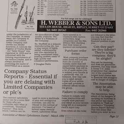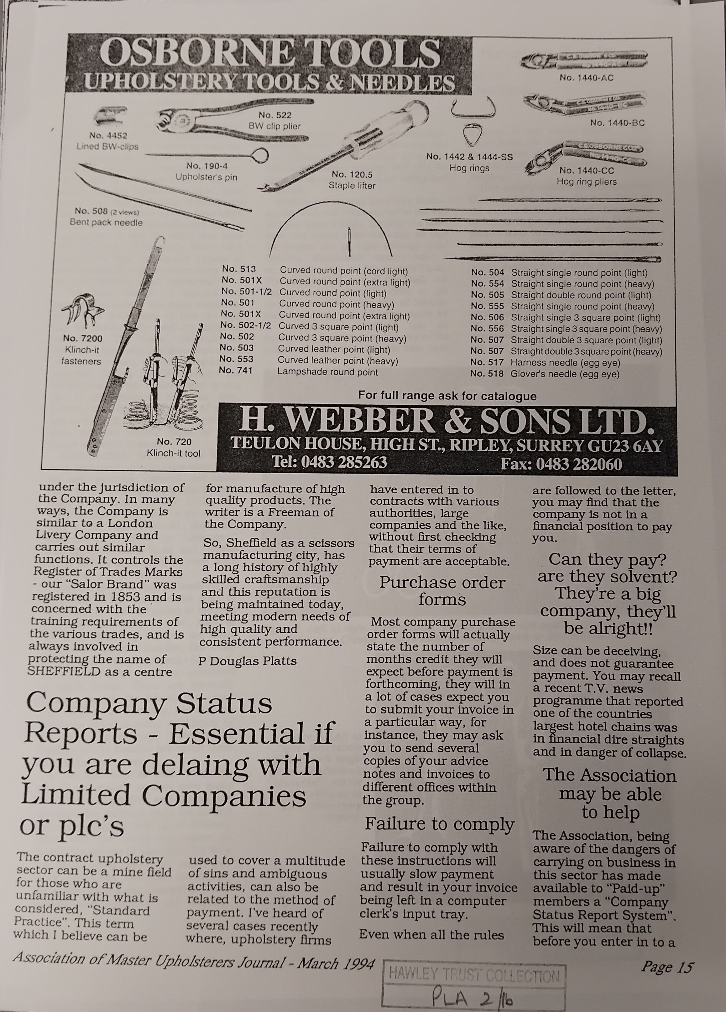 (This article appeared in the March 1994 edition of the Association of Master Upholsterers Journal, and is reproduced here with the kind permission of the Association of Master Upholsterers and Soft Furnishers Ltd. A photocopy of the article is held by the Ken Hawley Collection Trust in Sheffield.)