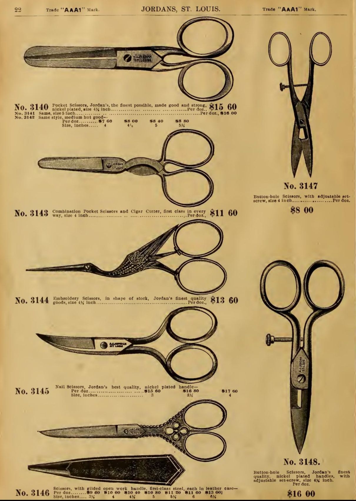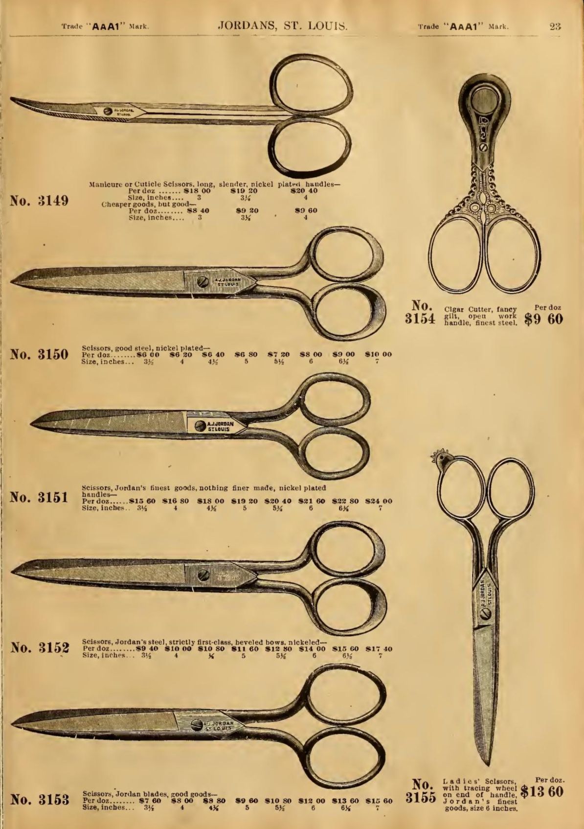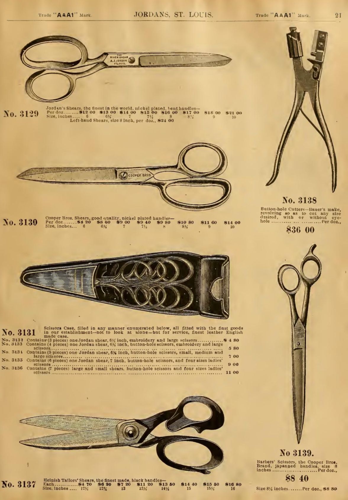 A. J. Jordan was a cutlery company based in St Louis, Missouri, with a factory based in Sheffield. There is no date on the catalogue, but the factory address at Baker's Hill dates it between the late 1880s - 1900, around which date the factory had moved to Furnival Street (ref: Tweedale, 2010). This tallies with a handwritten note saying "1890" in the top left hand corner of the introductory page. Scissors and shears illustrated include:
