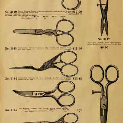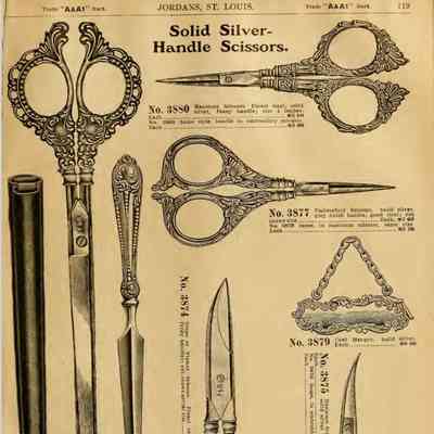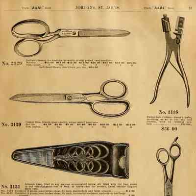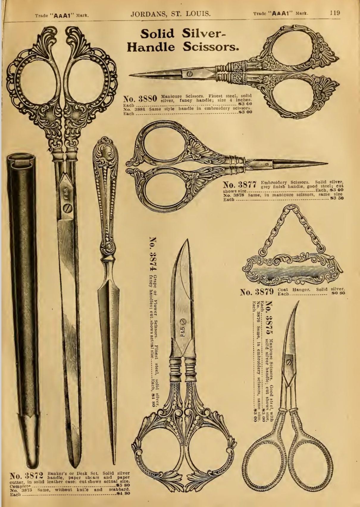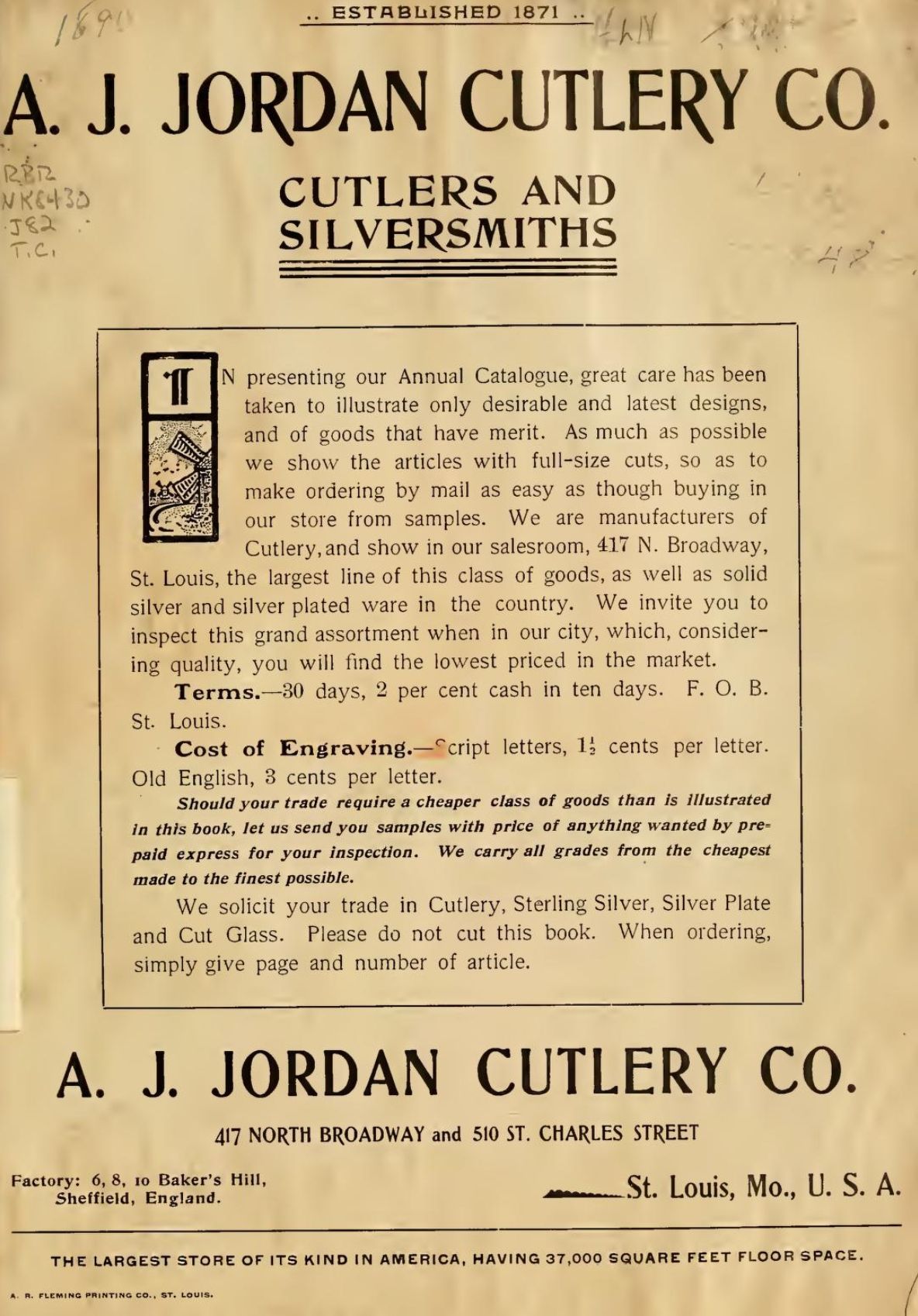A. J. Jordan was a cutlery company based in St Louis, Missouri, with a factory based in Sheffield. There is no date on the catalogue, but the factory address at Baker's Hill dates it between the late 1880s - 1900, around which date the factory had moved to Furnival Street (ref: Tweedale, 2010). This tallies with a handwritten note saying "1890" in the top left hand corner of the introductory page. Scissors and shears illustrated include: