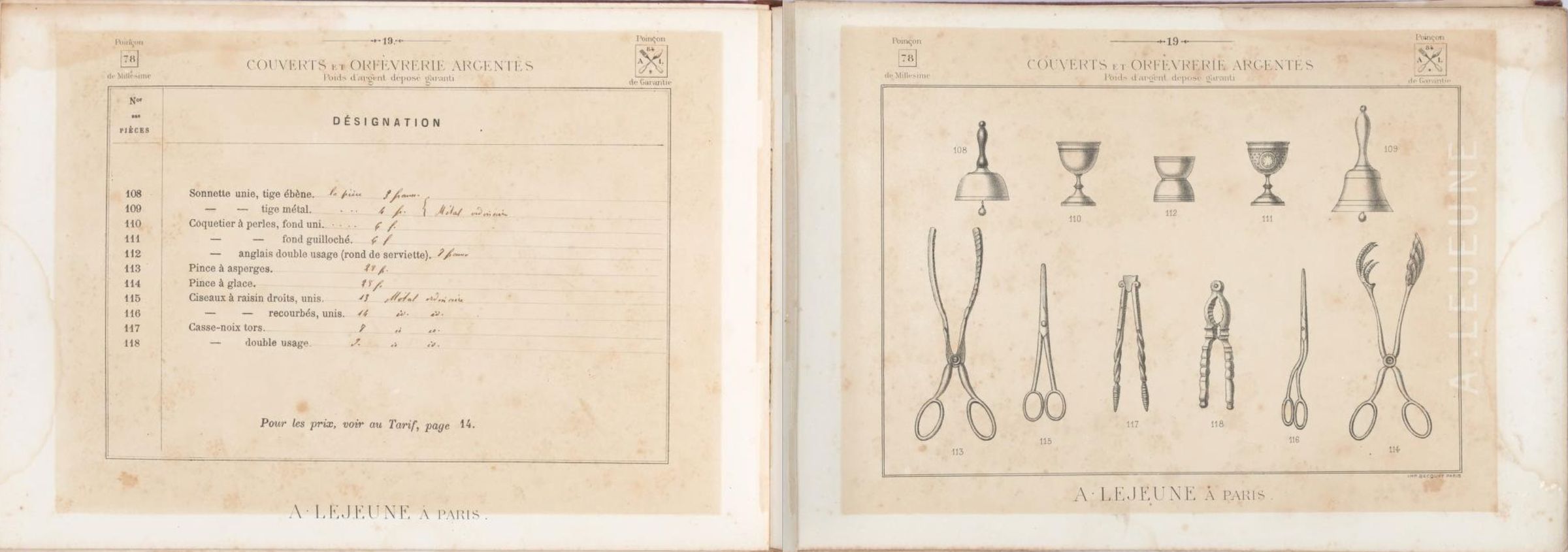 The 1884 catalogue of A. Lejeune, Paris, illustrates two pairs of grape scissors ("ciseaux à raisin") - one with straight shanks, the other with bent shanks.Publication Details