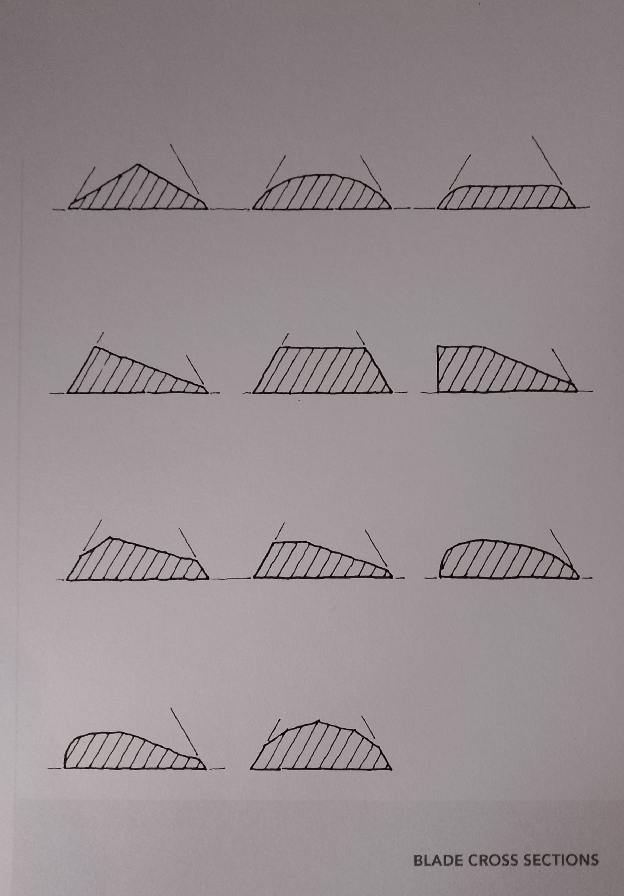 Cross sections can be divided into symmetrical (CS1, CS2, CS3, CS5, CS11) and asymmetrical (CS4, CS6, CS7, CS8, CS9, CS10). The ease of manufacture of the asymmetrical knife grind (CS4) is one reason why it is the most common blade cross section, but others such as the dagger grind (CS1) and rounded (CS2) are also common.