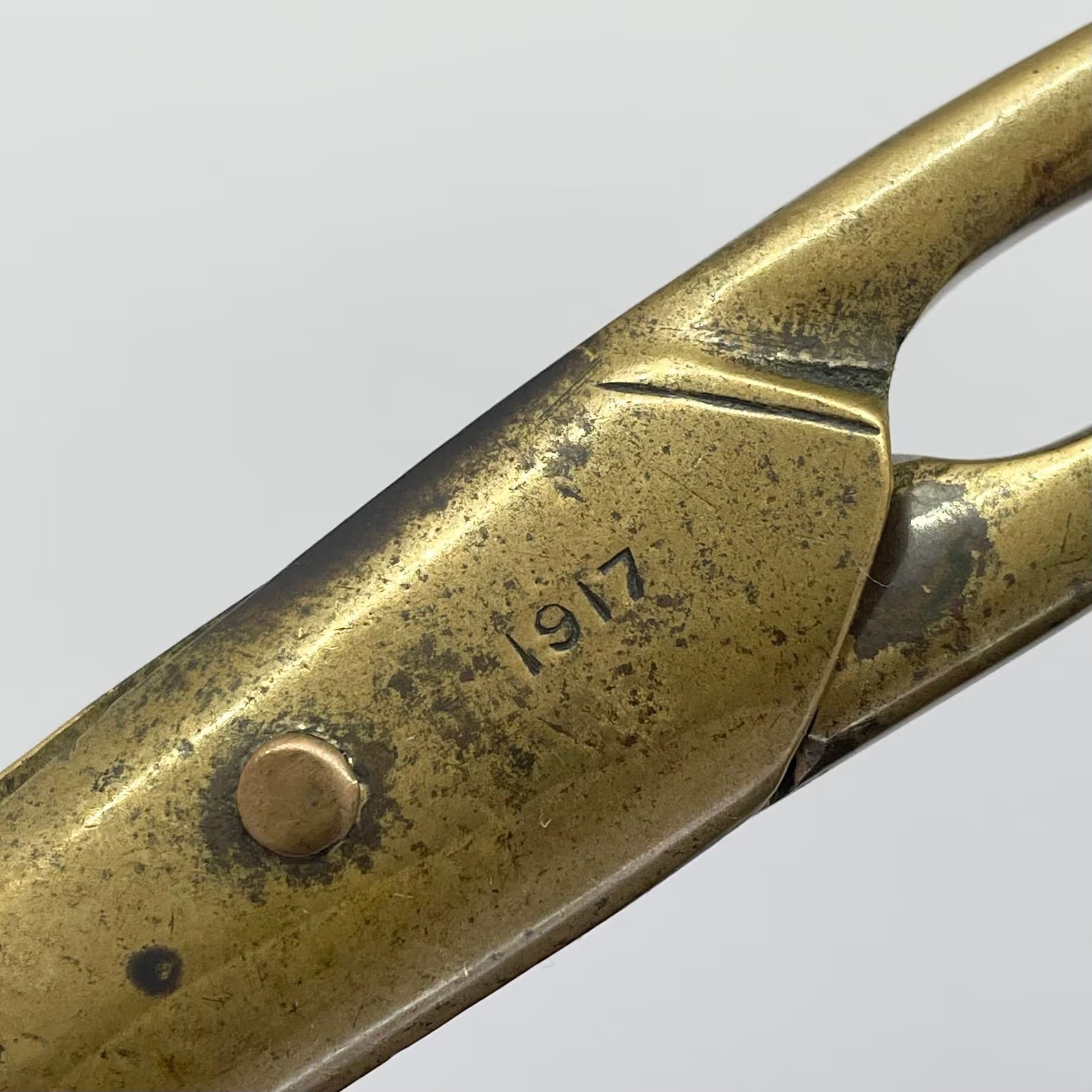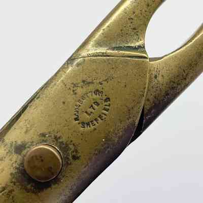 Bronze was used to make 'anti-spark' scissors, safe for use in munitions works. This pair is marked "1917" and "RAMSBOTTOM LTD SHEFFIELD'. There are pairing marks on the unders.Made/Created