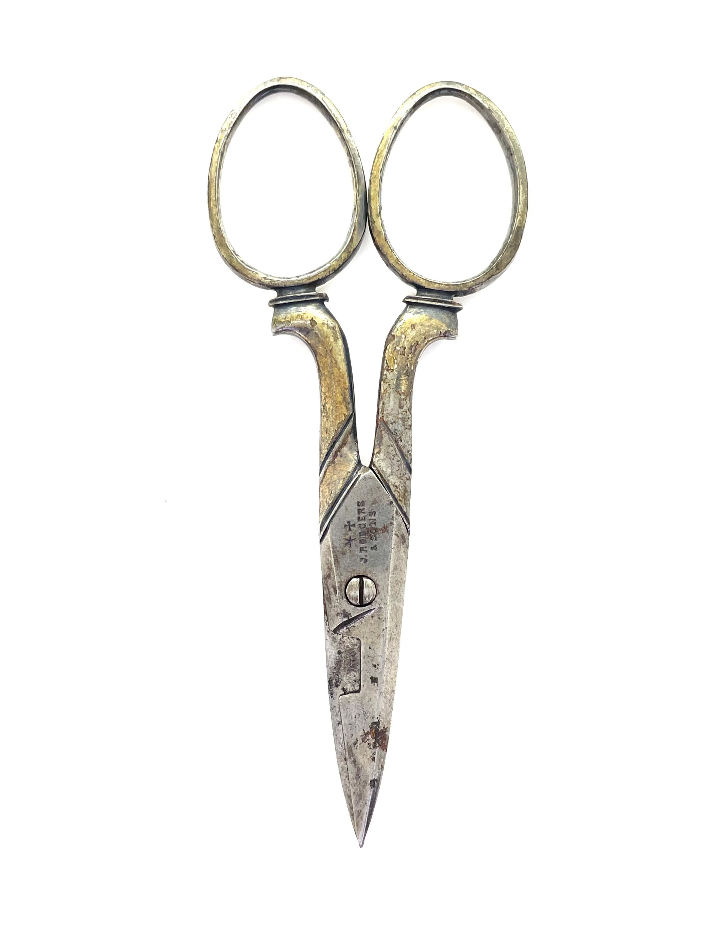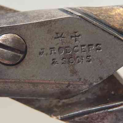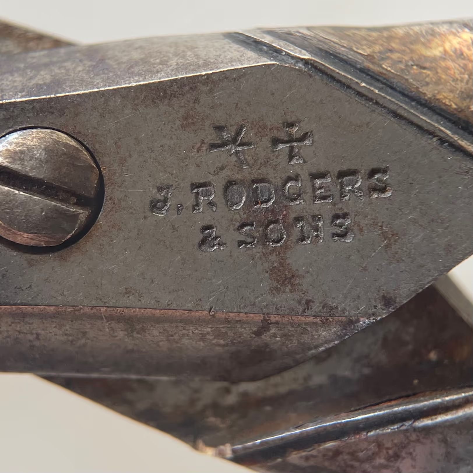 A pair of buttonhole scissors marked "J. RODGERS & SONS" with the star and Maltese cross. Nickel plated shanks and finger bows (possibly originally silver plated). Shank is thread-neck bat, pivot is a screw; shoulder is st3 and cross section is cs4. Pairing marks on the unders.Made/Created