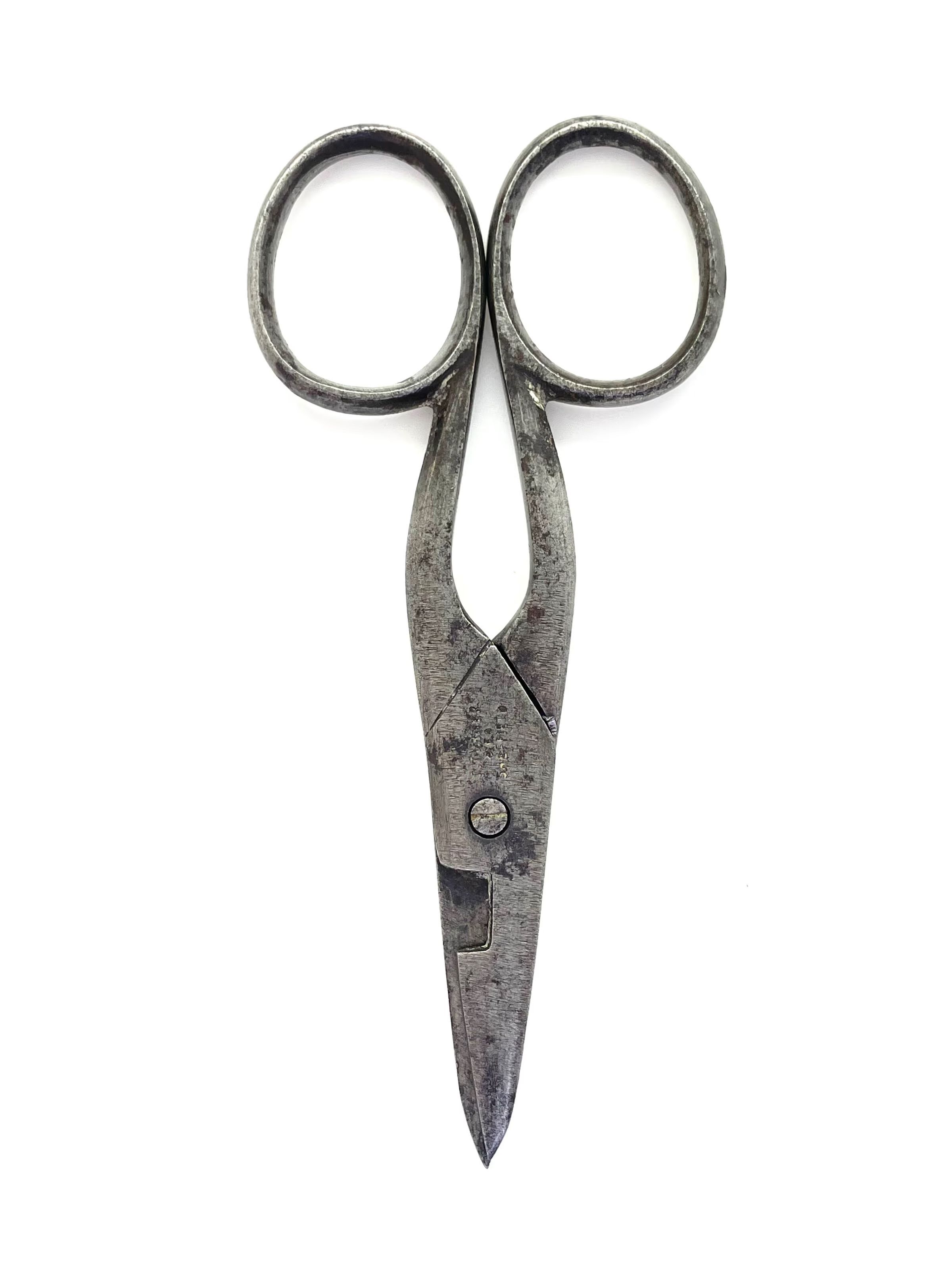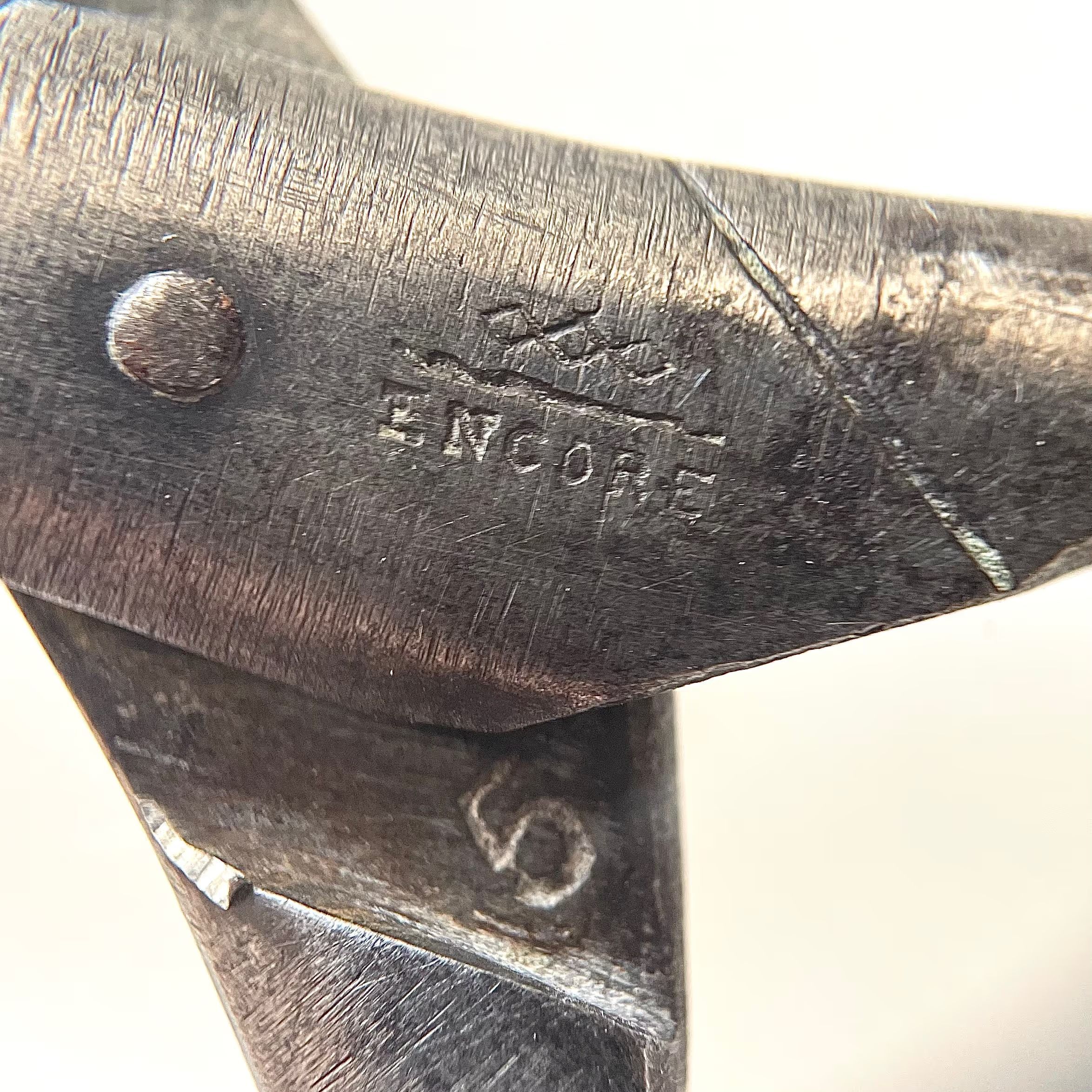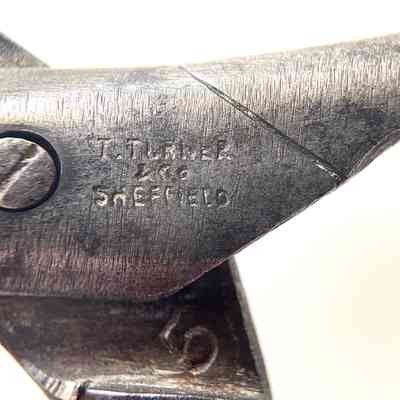 A small pair of button hole scissors marked "THOMAS TURNER & CO SHEFFIELD" on one side of the pivot area, and "ENCORE" with a design made of three diamonds and a line on the other. Pairing marks on the unders. Pivot is a screw, blade is leaf point with cs2 cross section, and there is no shoulder transition. Shanks are tup.Made/Created