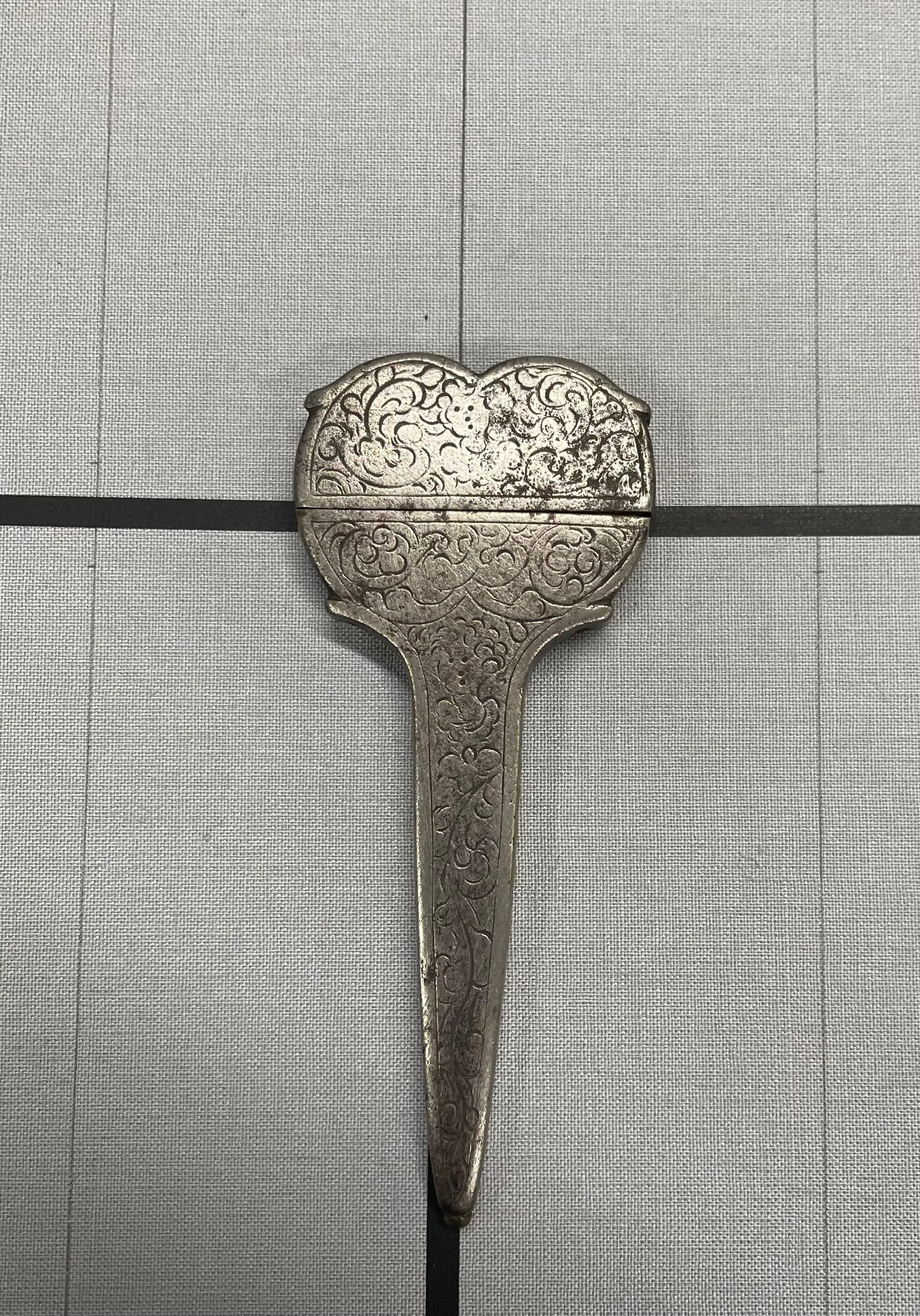 An iron chatelaine sheath decorated with engraved scrolls.Cataloged By