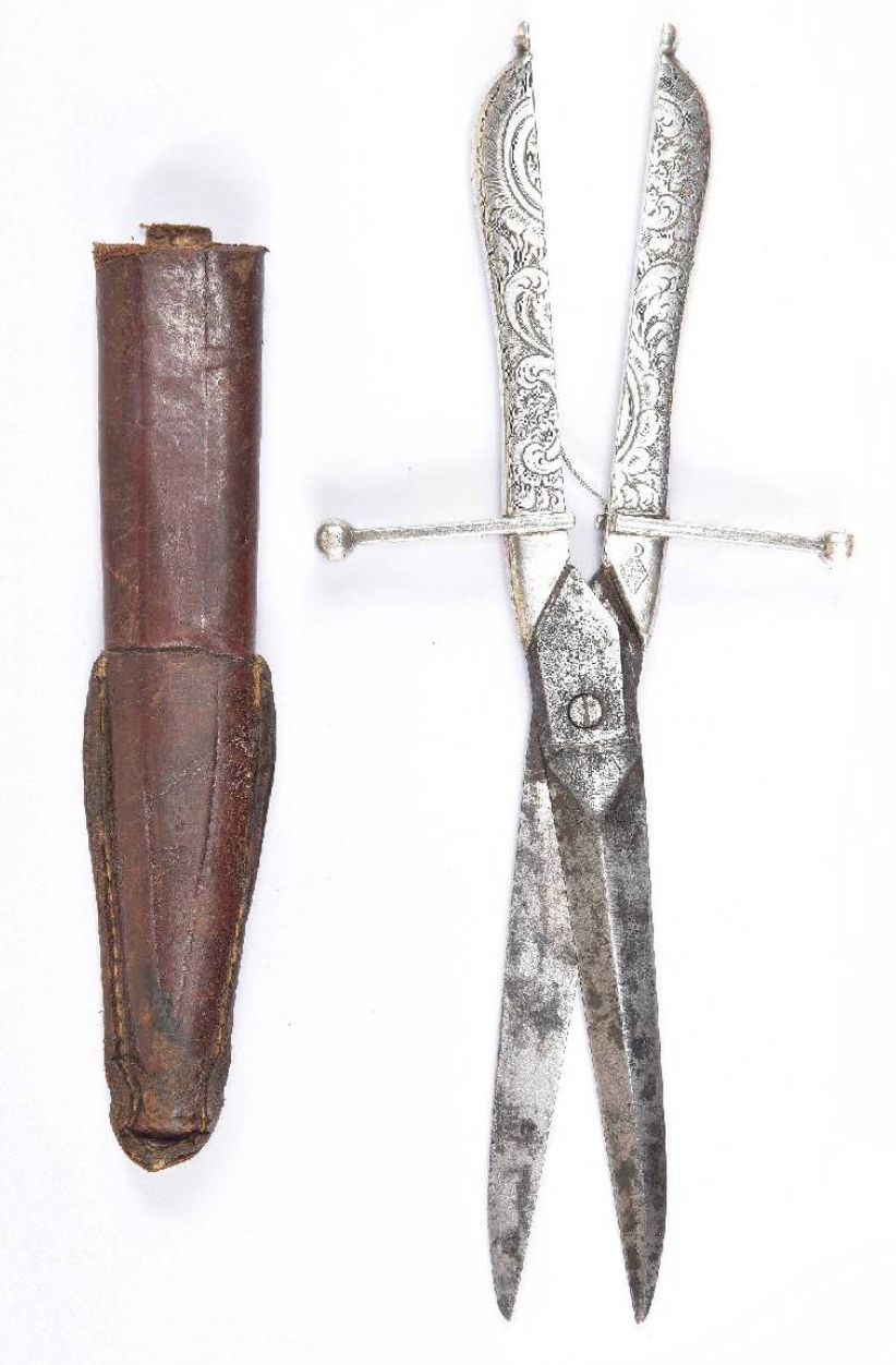 A pair of carbon and silver dagger scissors (hallmarked for Thomas Johnson, London, 1864). The blades are stamped 'Thornhill, New Bond St'. The silver cross guard and grip are finely engraved with foliate decoration.Cataloged By